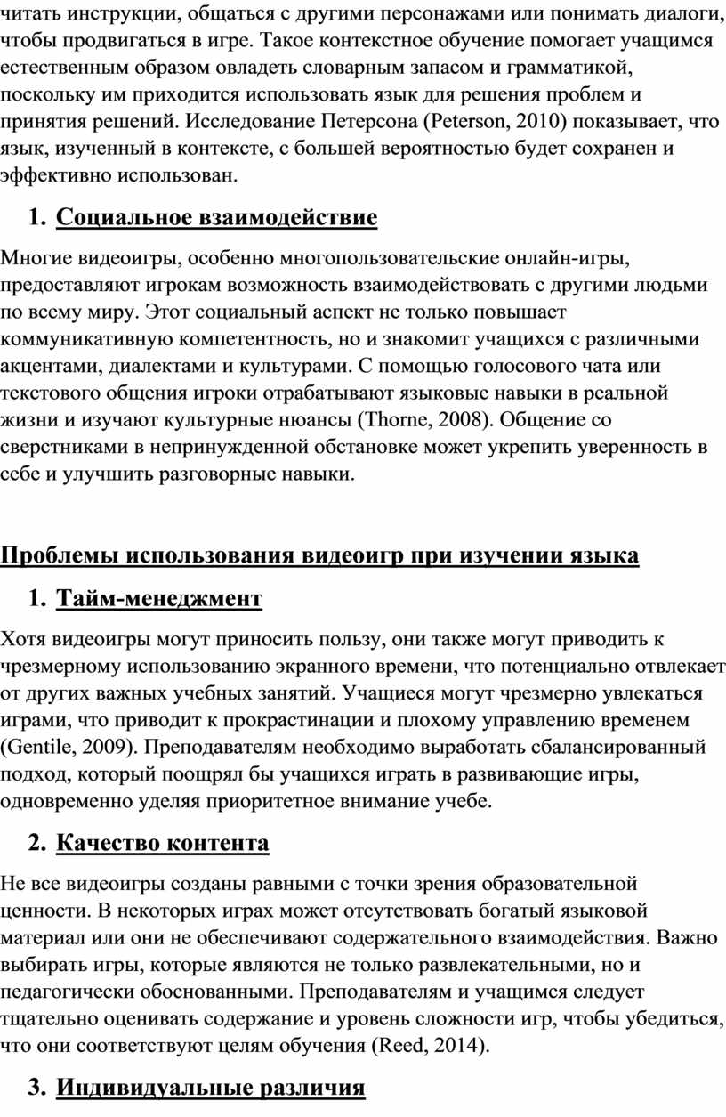 В заключение необходимо отметить, что видеоигры могут оказать значительное влияние на изучение английского языка, предлагая уникальные возможности для вовлечения, контекстного обучения и социального взаимодействия. Однако преподаватели и учащиеся также должны осознавать потенциальные проблемы, в том числе связанные с управлением временем и качеством контента. Продуманно интегрируя видеоигры в учебные программы по изучению языков, мы можем использовать их преимущества для создания более динамичного и эффективного процесса обучения. Необходимы дальнейшие исследования, чтобы изучить долгосрочное влияние видеоигр на уровень владения языком и определить наилучшие методы их использования в образовательных учреждениях.
