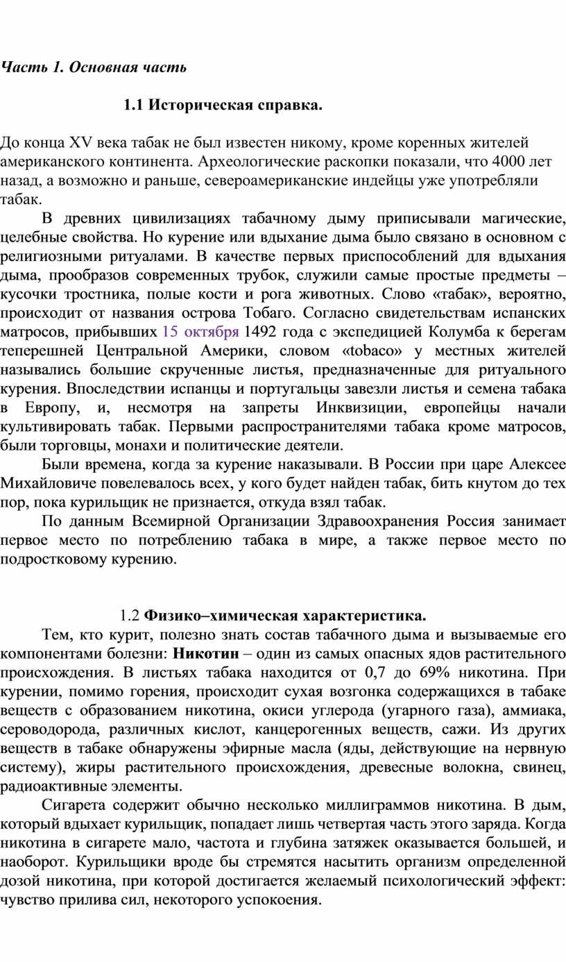 В первой части моей работы дана краткая характеристика табакокурения. Рассмотрены: историческая справка о табаке, физико-химическая характеристика табака, влияние курения на организм человека, причины курения подростков.