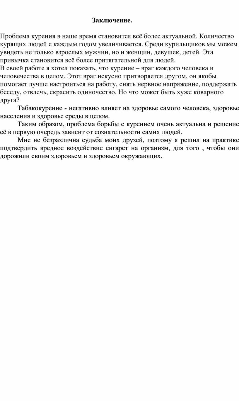 Таким образом, проблема борьбы с курением очень актуальна и решение её в первую очередь зависит от сознательности самих людей.