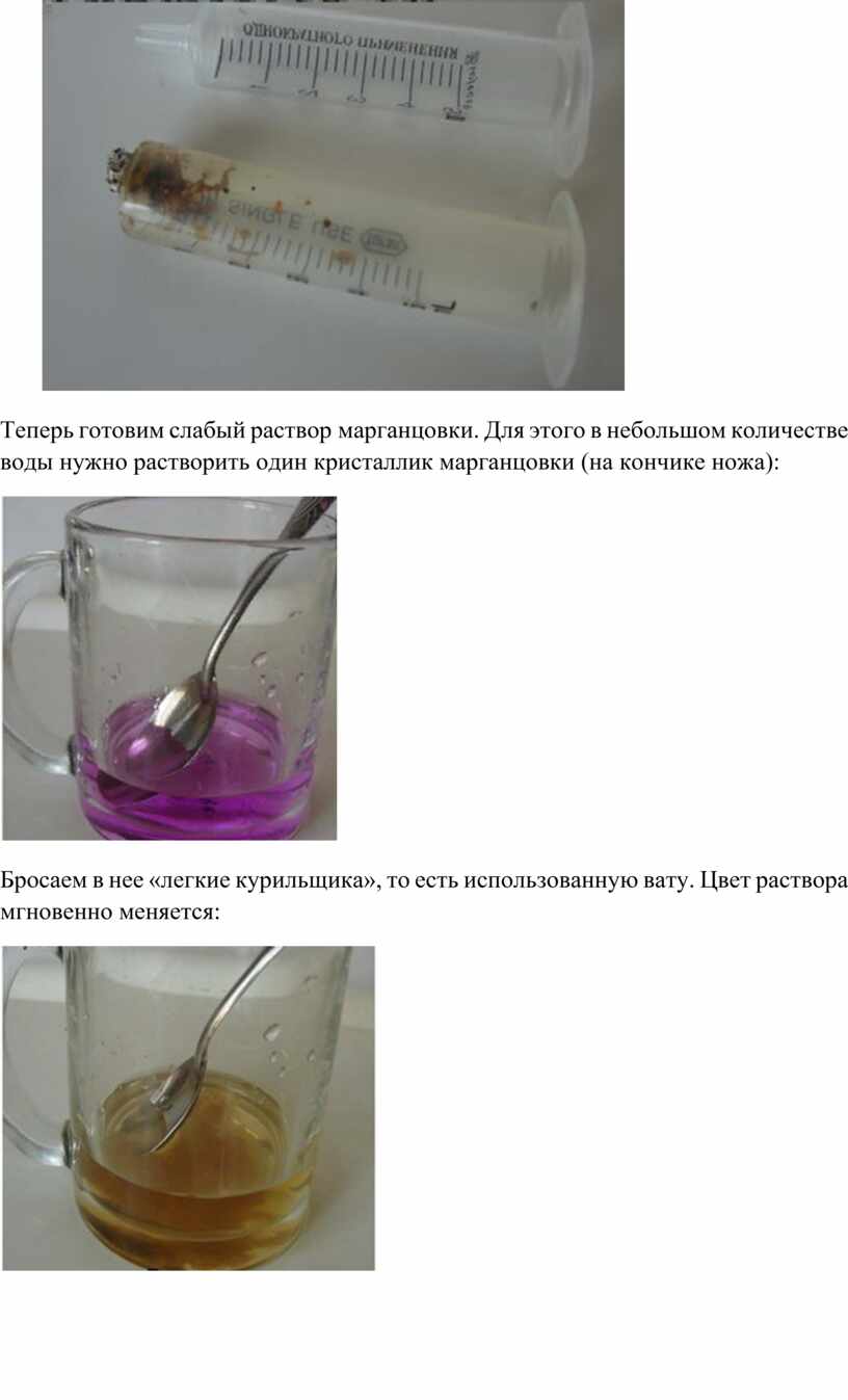 И небольшое объяснение происходящему. Во вдыхаемом дыме от сигареты содержатся различные вещества: оксиды азота, пиридин, аммиак и ароматические амины. Твердая фаза дыма содержит никотин и смолу (табачный деготь). Все это и придало такой цвет вате. Эти же вещества активно взаимодействовали с раствором марганцовки и изменили ее цвет.