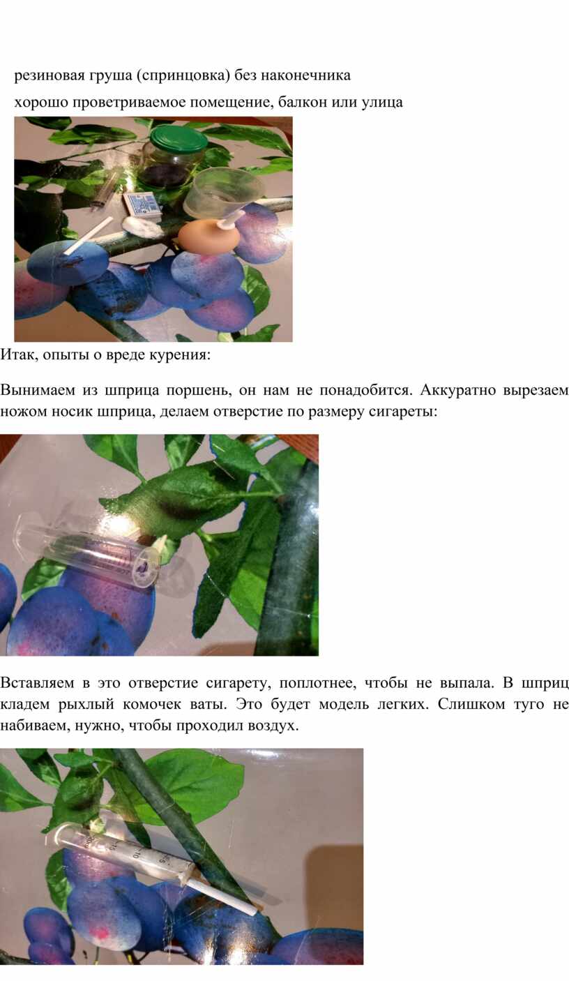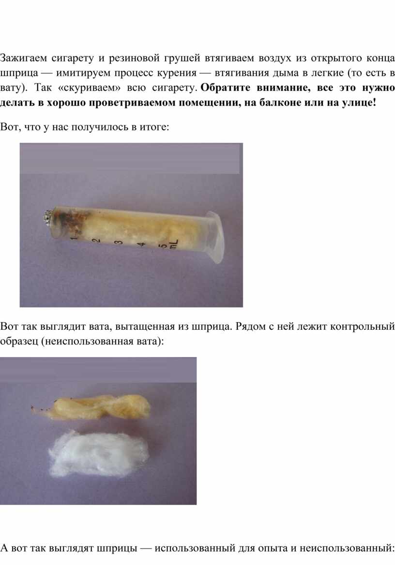 Зажигаем сигарету и резиновой грушей втягиваем воздух из открытого конца шприца — имитируем процесс курения — втягивания дыма в легкие (то есть в вату). Так «скуриваем» всю сигарету. Обратите внимание, все это нужно делать в хорошо проветриваемом помещении, на балконе или на улице!