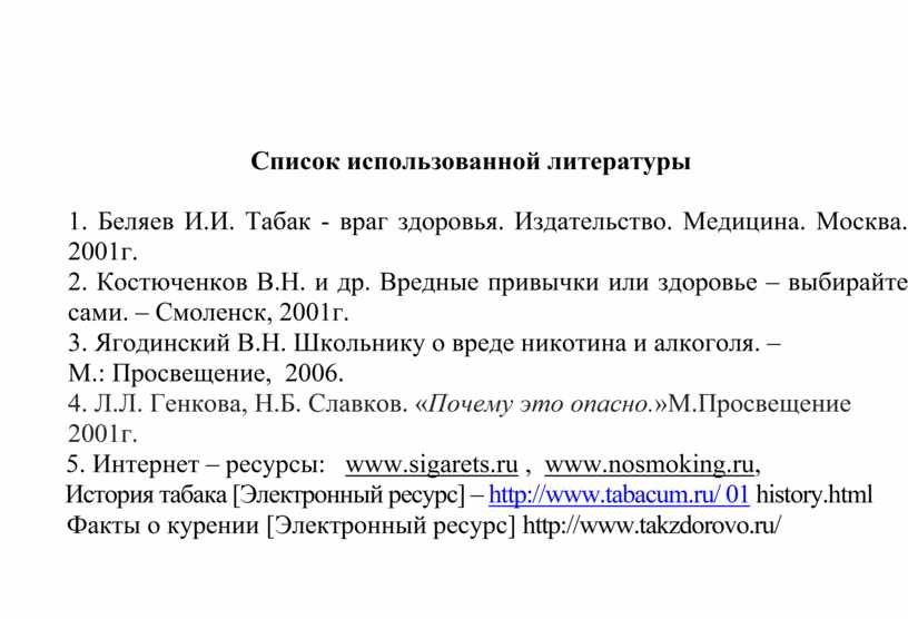 1. Беляев И.И. Табак - враг здоровья. Издательство. Медицина. Москва. 2001г.