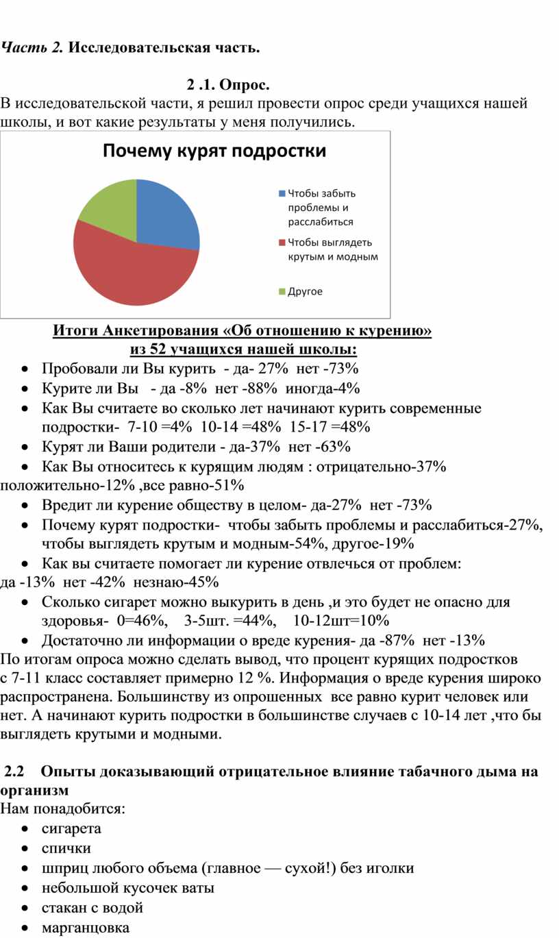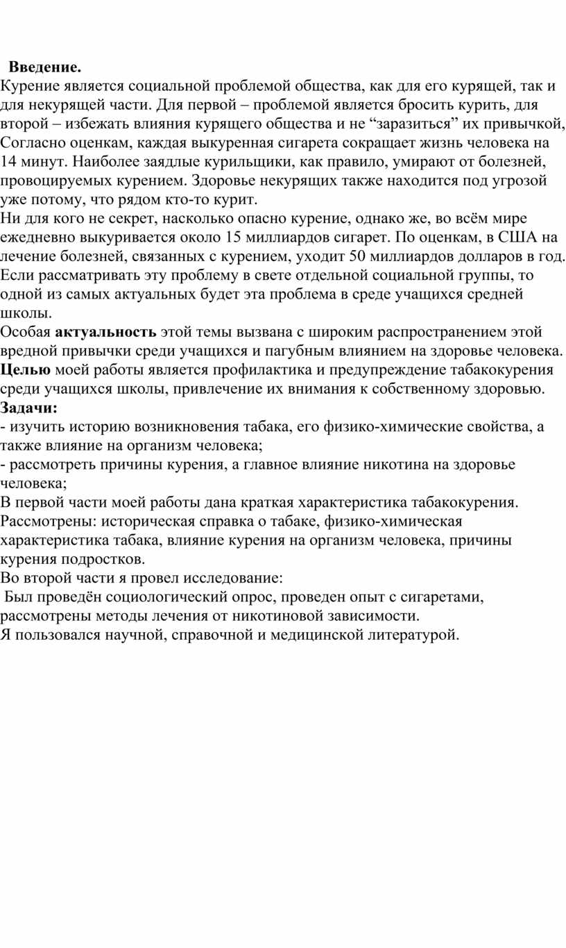 Был проведён социологический опрос, проведен опыт с сигаретами, рассмотрены методы лечения от никотиновой зависимости.