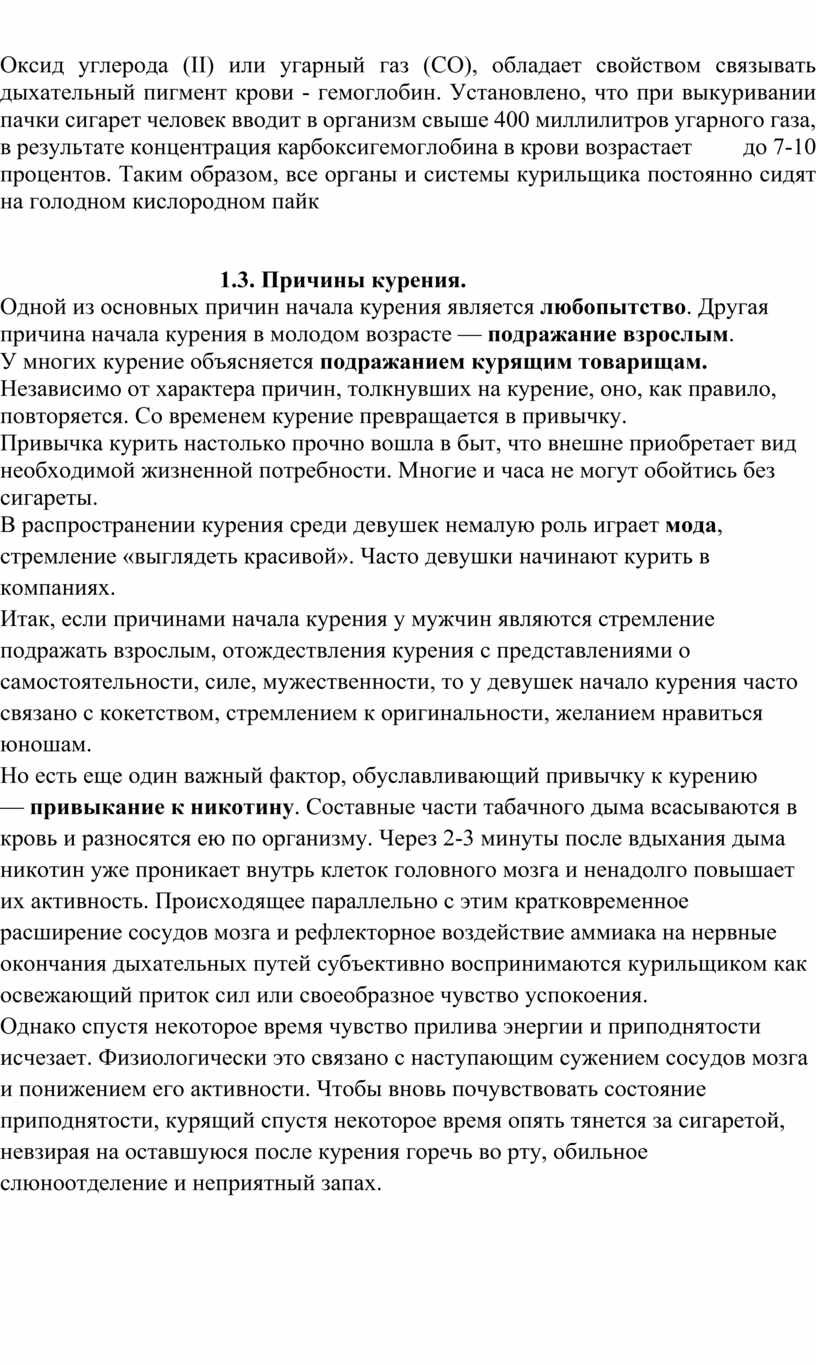 Оксид углерода (II) или угарный газ (CО), обладает свойством связывать дыхательный пигмент крови - гемоглобин. Установлено, что при выкуривании пачки сигарет человек вводит в организм свыше 400 миллилитров угарного газа, в результате концентрация карбоксигемоглобина в крови возрастает до 7-10 процентов. Таким образом, все органы и системы курильщика постоянно сидят на голодном кислородном пайк
