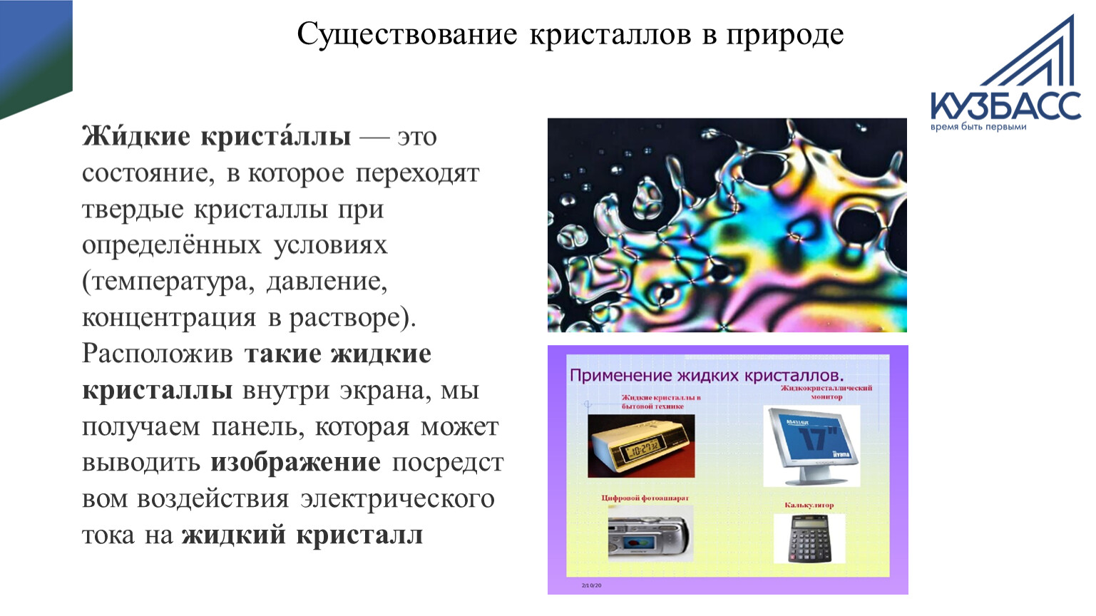 Жи́дкие криста́ллы — это состояние, в которое переходят твердые кристаллы при определённых условиях (температура, давление, концентрация в растворе).
