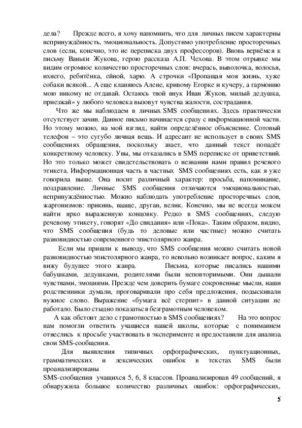 исследовательская работа на тему "SMS сообщения как разновидность эпистолярного жанра" (7 кл)В ходе исследования учащаяся пыталась найти подтверждение своей гипотезе: SMS сообщения можно считать новой разновидностью эпистолярного жанра. Был сделан сравнительный анализ писем прошлых лет и современных SMS сообщений. Бумажные письма по праву считаются величайшими культурными ценностями человечества. Письмо - это такое средство общения, которое помогает человеку сохранить духовные, родственные, личные традиции. Письма передают настроение, раскрывают душу человека. Но стремительность жизни заставляет нас общаться быстро, кратко.
