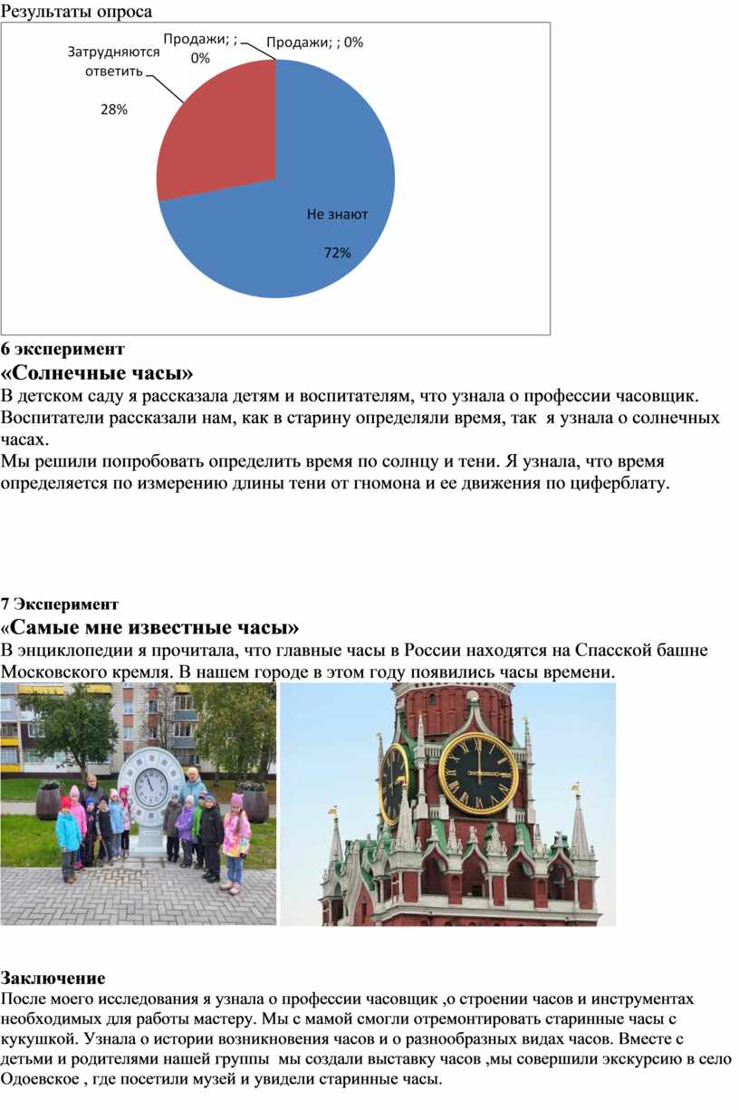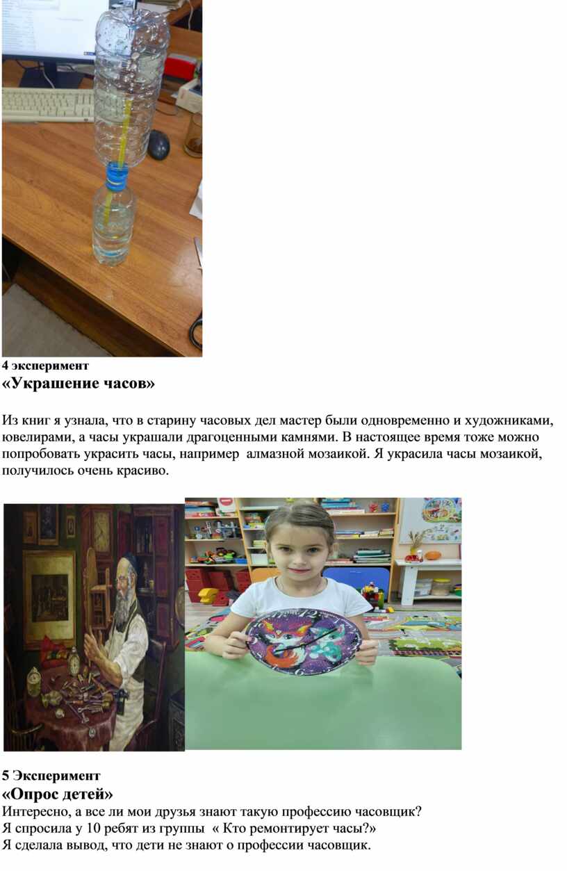 После моего исследования я узнала о профессии часовщик ,о строении часов и инструментах необходимых для работы мастеру. Мы с мамой смогли отремонтировать старинные часы с кукушкой. Узнала о истории возникновения часов и о разнообразных видах часов. Вместе с детьми и родителями нашей группы мы создали выставку часов ,мы совершили экскурсию в село Одоевское , где посетили музей и увидели старинные часы.