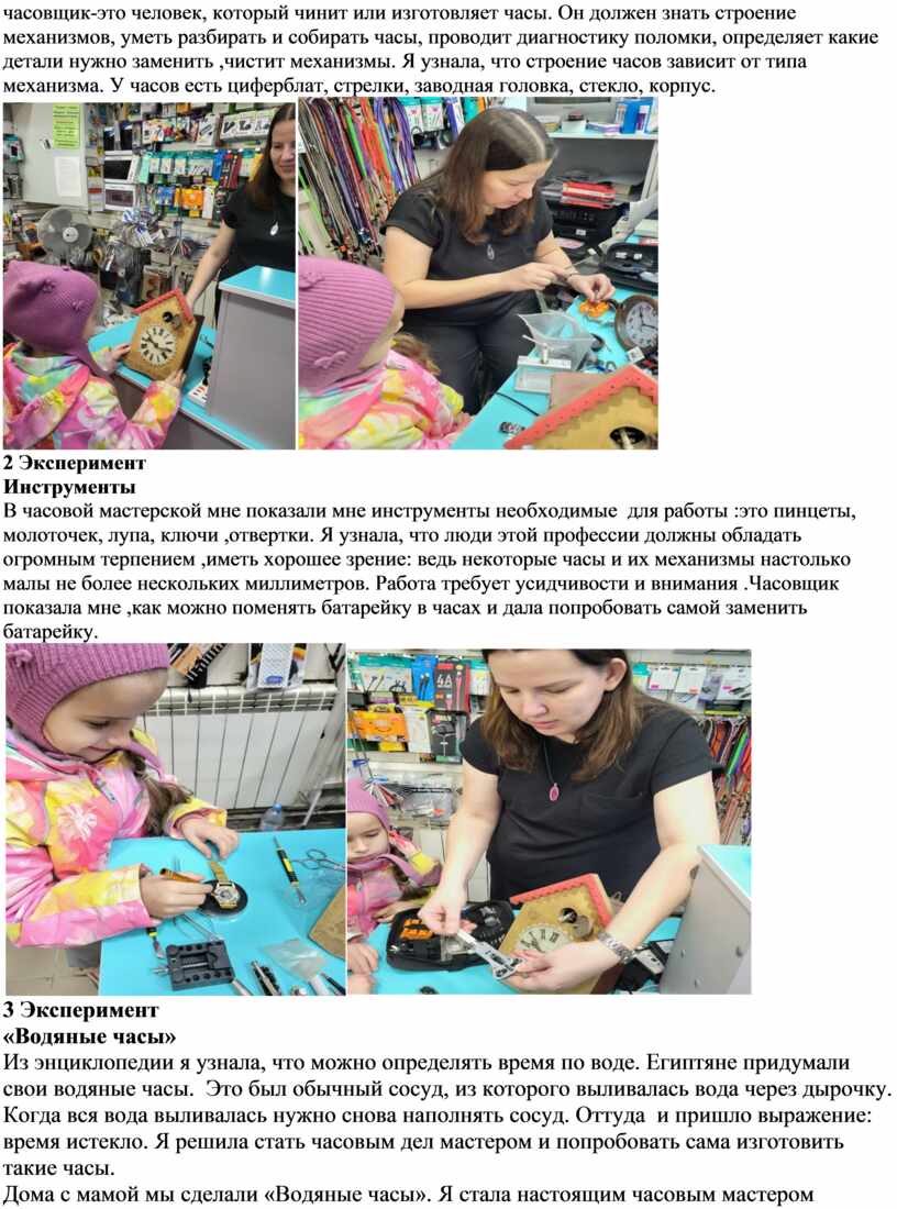 В часовой мастерской мне показали мне инструменты необходимые для работы :это пинцеты, молоточек, лупа, ключи ,отвертки. Я узнала, что люди этой профессии должны обладать огромным терпением ,иметь хорошее зрение: ведь некоторые часы и их механизмы настолько малы не более нескольких миллиметров. Работа требует усидчивости и внимания .Часовщик показала мне ,как можно поменять батарейку в часах и дала попробовать самой заменить батарейку.