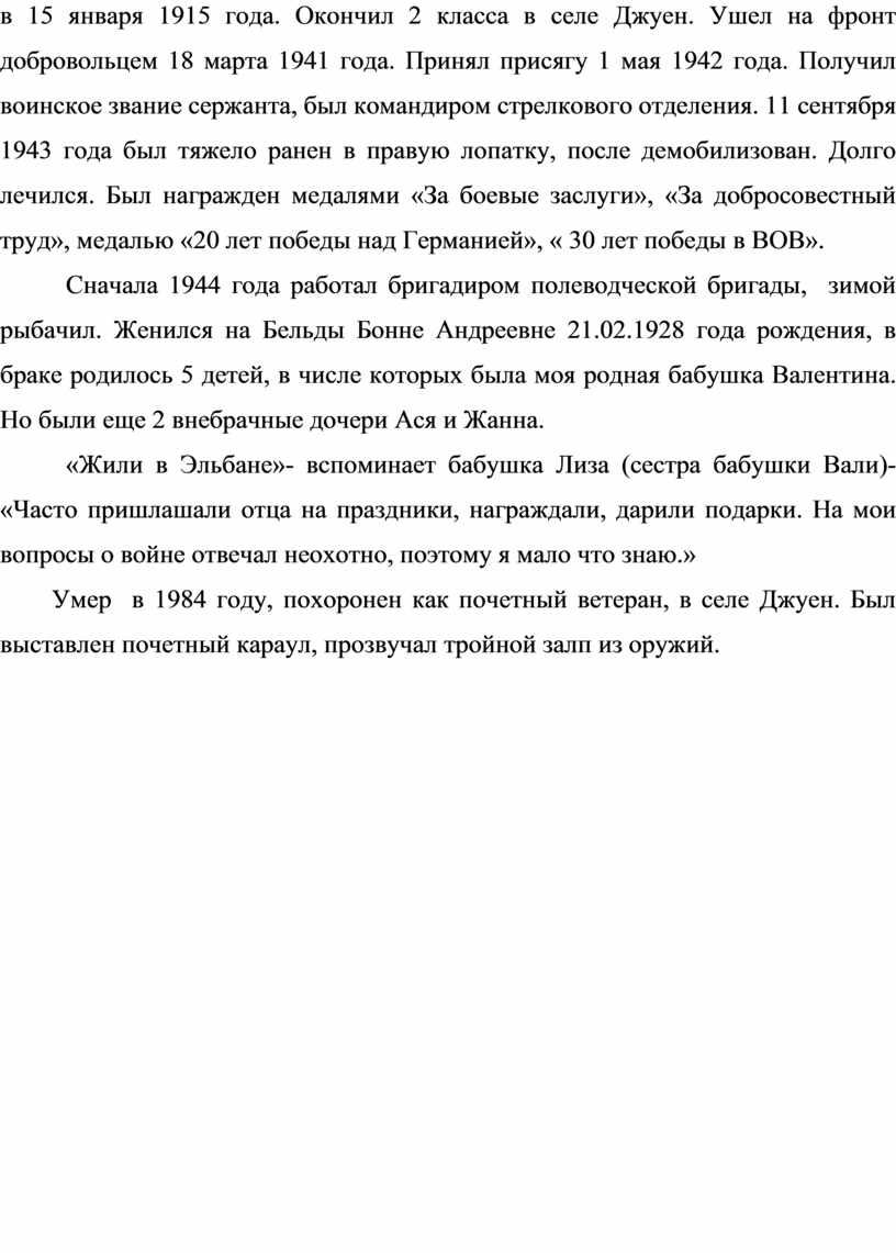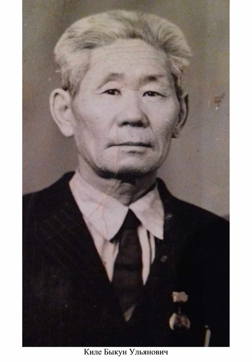 Мой прадудушка, дедушка моей мамы, Киле Быкуна Ульянович родился в 15 января 1915 года. Окончил 2 класса в селе Джуен. Ушел на фронт добровольцем 18 марта 1941 года. Принял присягу 1 мая 1942 года. Получил воинское звание сержанта, был командиром стрелкового отделения. 11 сентября 1943 года был тяжело ранен в правую лопатку, после демобилизован. Долго лечился. Был награжден медалями «За боевые заслуги», «За добросовестный труд», медалью «20 лет победы над Германией», « 30 лет победы в ВОВ».