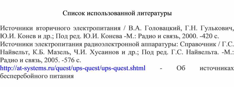 2. Источники электропитания радиоэлектронной аппаратуры: Справочник / Г.С. Найвельт, К.Б. Мазель, Ч.И. Хусаинов и др.; Под ред. Г.С. Найвельта. -М.: Радио и связь, 2005. -576 с.