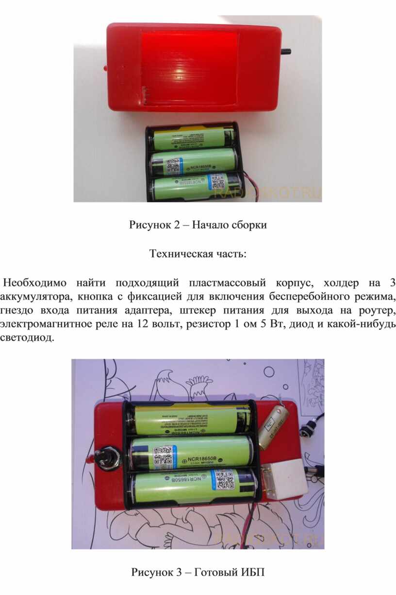 Необходимо найти подходящий пластмассовый корпус, холдер на 3 аккумулятора, кнопка с фиксацией для включения бесперебойного режима, гнездо входа питания адаптера, штекер питания для выхода на роутер, электромагнитное реле на 12 вольт, резистор 1 ом 5 Вт, диод и какой-нибудь светодиод.