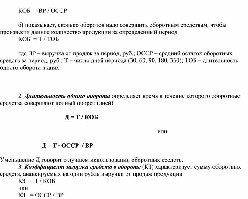 где ВР – выручка от продаж за период, руб.; ОССР – средний остаток оборотных средств за период, руб.; Т – число дней периода (30, 60, 90, 180, 360); ТОБ – длительность одного оборота в днях.