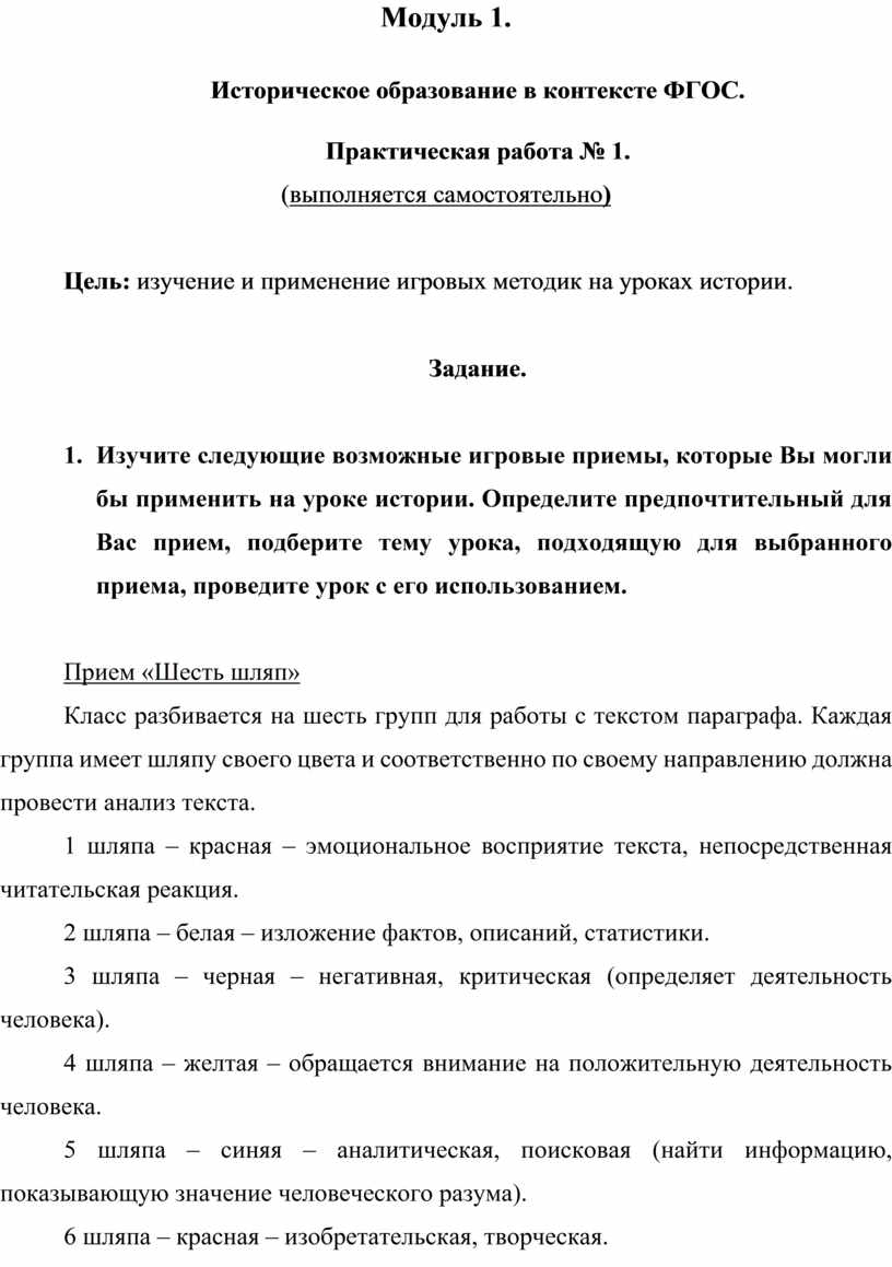 1. Изучите следующие возможные игровые приемы, которые Вы могли бы применить на уроке истории. Определите предпочтительный для Вас прием, подберите тему урока, подходящую для выбранного приема, проведите урок с его использованием.