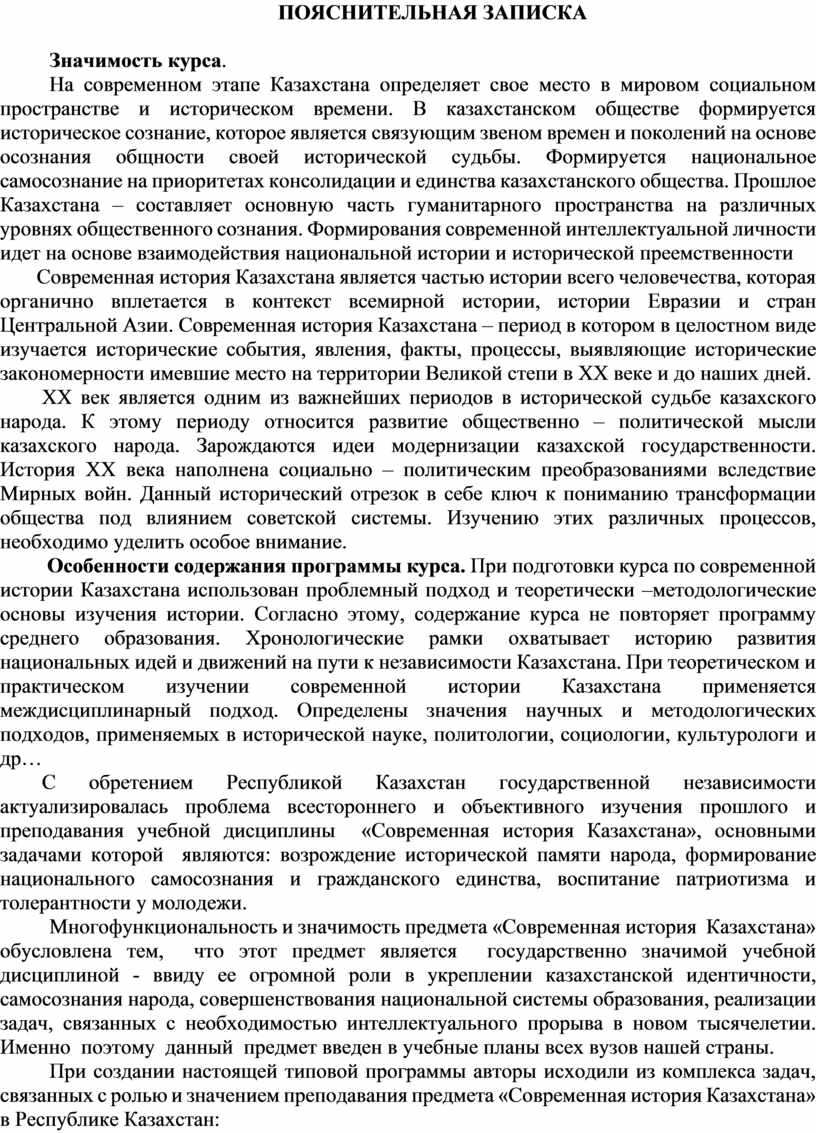 Особенности содержания программы курса. При подготовки курса по современной истории Казахстана использован проблемный подход и теоретически –методологические основы изучения истории. Согласно этому, содержание курса не повторяет программу среднего образования. Хронологические рамки охватывает историю развития национальных идей и движений на пути к независимости Казахстана. При теоретическом и практическом изучении современной истории Казахстана применяется междисциплинарный подход. Определены значения научных и методологических подходов, применяемых в исторической науке, политологии, социологии, культурологи и др…