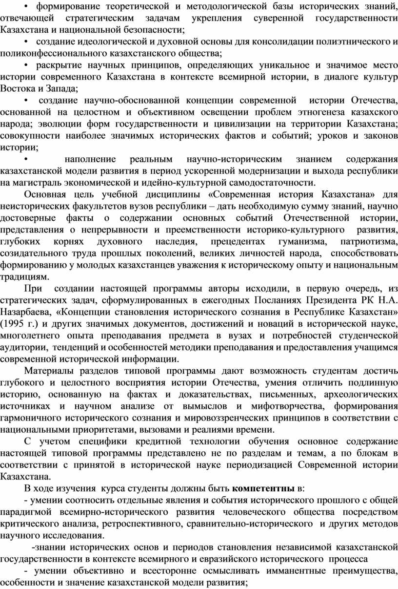 С учетом специфики кредитной технологии обучения основное содержание настоящей типовой программы представлено не по разделам и темам, а по блокам в соответствии с принятой в исторической науке периодизацией Современной истории Казахстана.