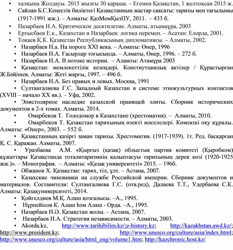 • Akorda.kz, http://www.tarihibilim.kz/;e-history.kz; http://kazakhstan.awd.kz/; http://www.president.kz; http://www.unesco.org/culture/asia/index.html; http://www.unesco.org/culture/asia/html_eng/volume1.htm; http://kazchronic.host.kz/