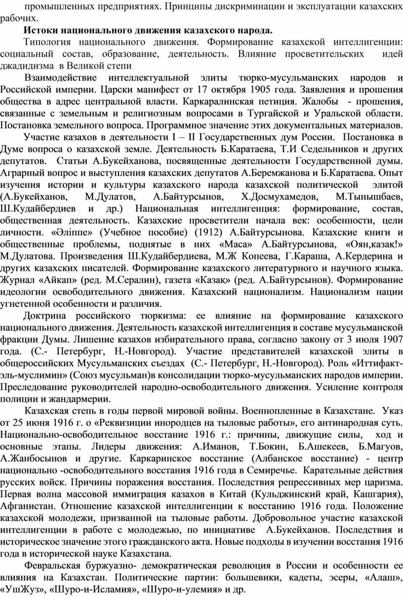 Участие казахов в деятельности I – II Государственных дум России. Постановка в Думе вопроса о казахской земле. Деятельность Б.Каратаева, Т.И Седельников и других депутатов. Статьи А.Букейханова, посвященные деятельности Государственной думы. Аграрный вопрос и выступления казахских депутатов А.Беремжанова и Б.Каратаева. Опыт изучения истории и культуры казахского народа казахской политической элитой (А.Букейханов, М.Дулатов, А.Байтурсынов, Х.Досмухамедов, М.Тынышбаев, Ш.Кудайбердиев и др.) Национальная интеллигенция: формирование, состав, общественная деятельность. Казахские просветители начала век: особенности, цели личности. «Әліппе» (Учебное пособие) (1912) А.Байтурсынова. Казахские книги и общественные проблемы, поднятые в них «Маса» А.Байтурсынова, «Оян,казақ!» М.Дулатова. Произведения Ш.Кудайбердиева, М.Ж Копеева, Г.Караша, А.Кердерина и других казахских писателей. Формирование казахского литературного и научного языка. Журнал «Айкап» (ред. М.Сералин), газета «Казақ» (ред. А.Байтурсынов). Формирование идеологии освободительного движения. Казахский национализм. Национализм нации угнетенной особенности и различия.