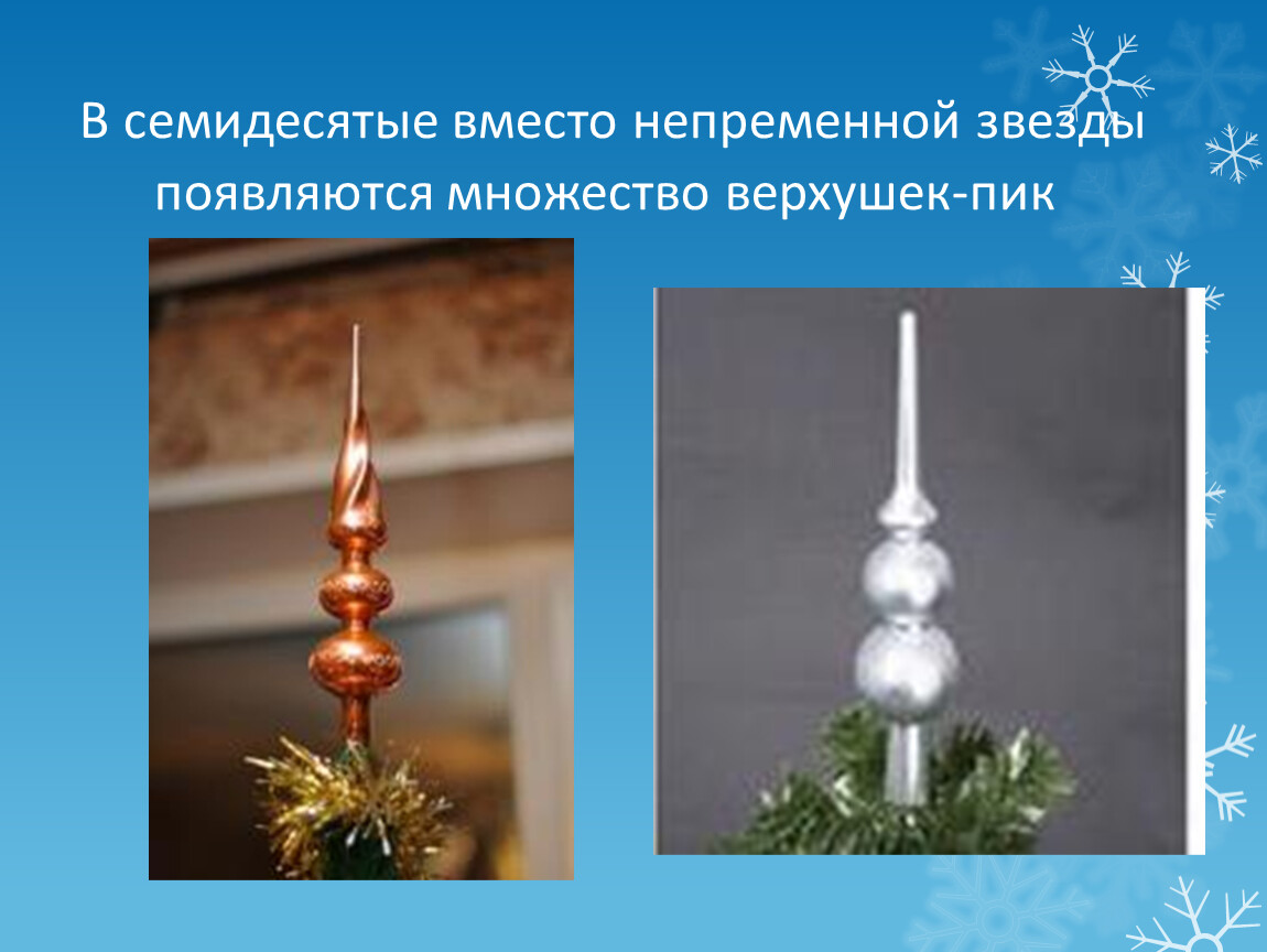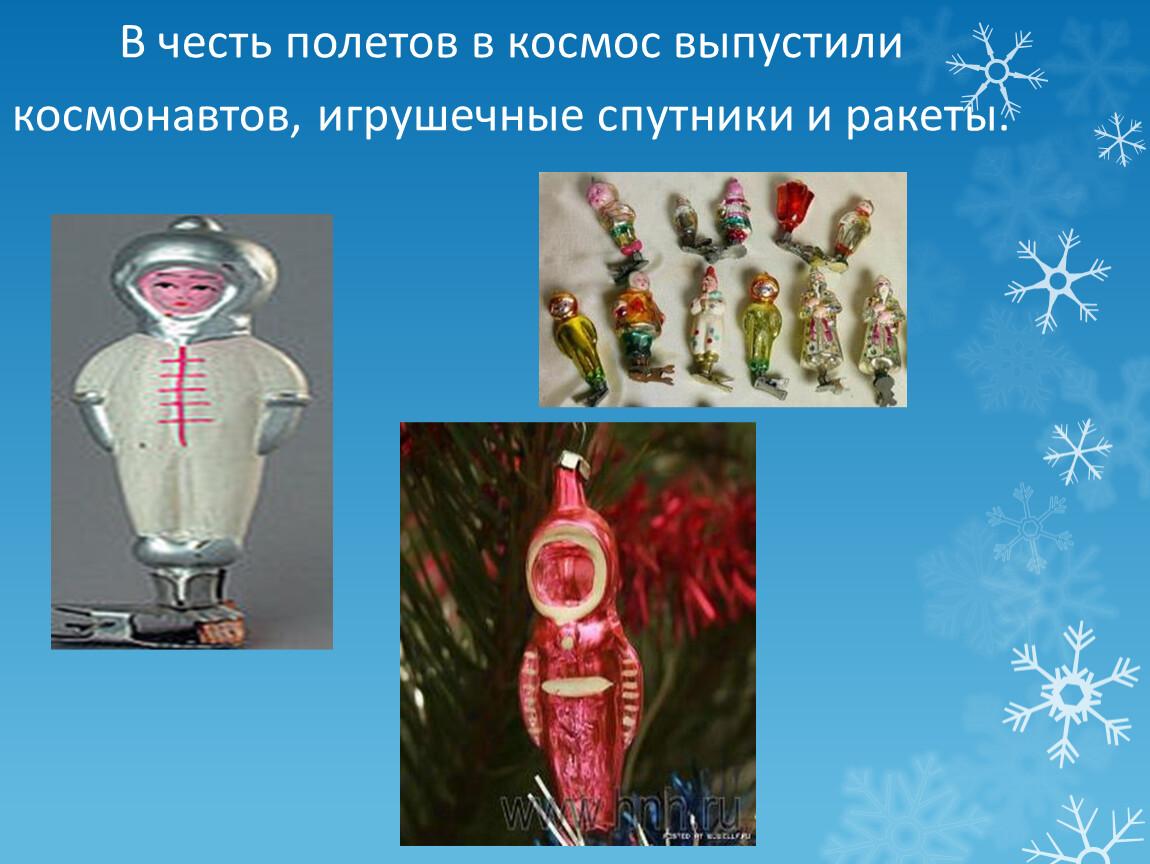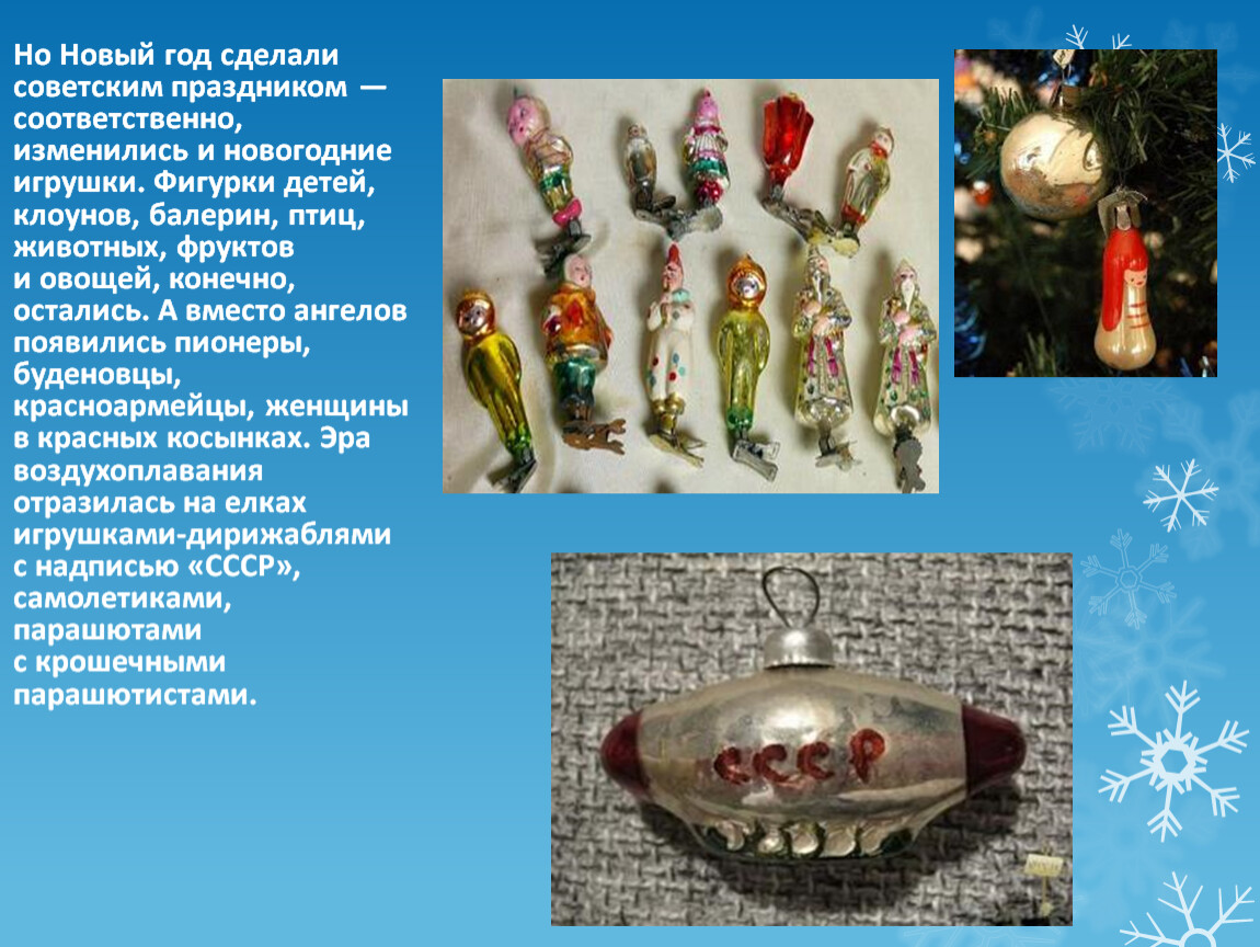 Но Новый год сделали советским праздником — соответственно, изменились и новогодние игрушки. Фигурки детей, клоунов, балерин, птиц, животных, фруктов и овощей, конечно, остались. А вместо ангелов появились пионеры, буденовцы, красноармейцы, женщины в красных косынках. Эра воздухоплавания отразилась на елках игрушками-дирижаблями с надписью «СССР», самолетиками, парашютами с крошечными парашютистами.