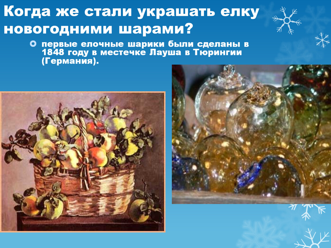 первые елочные шарики были сделаны в 1848 году в местечке Лауша в Тюрингии (Германия).
