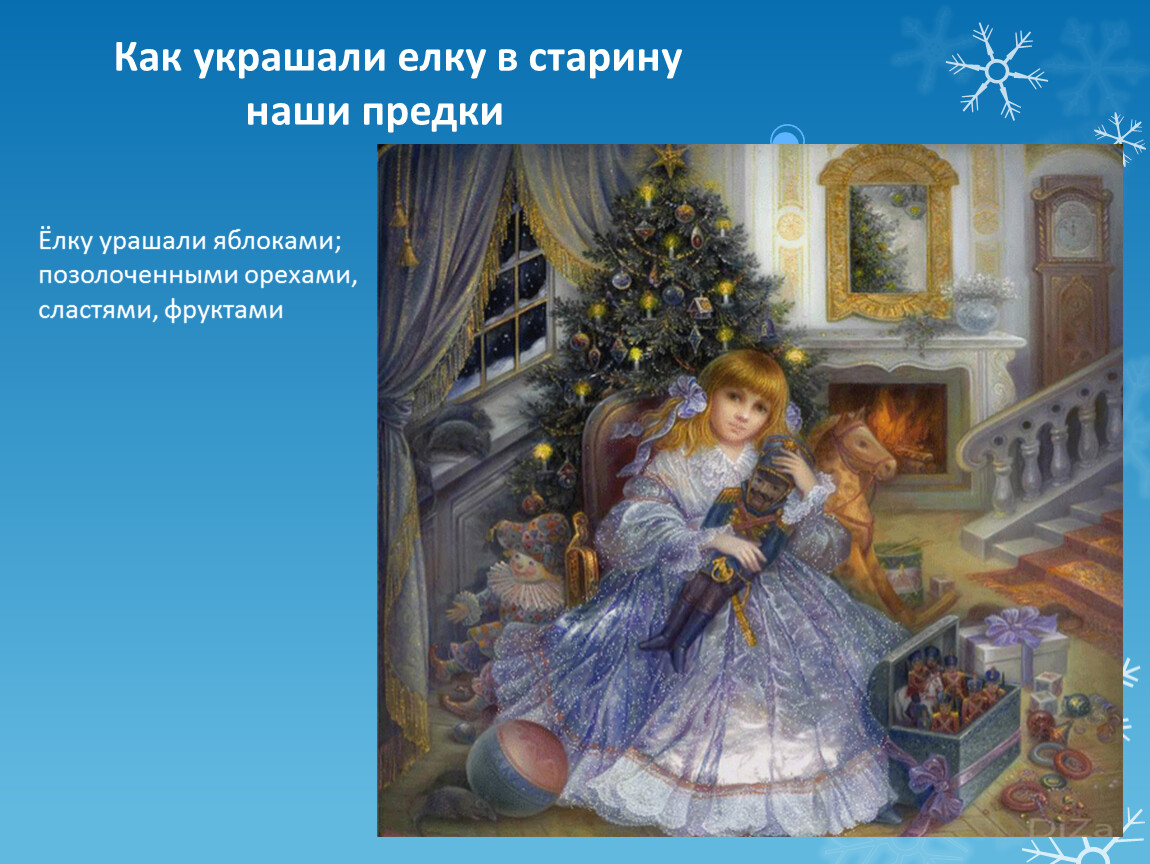 Ёлку урашали яблоками; позолоченными орехами, сластями, фруктами