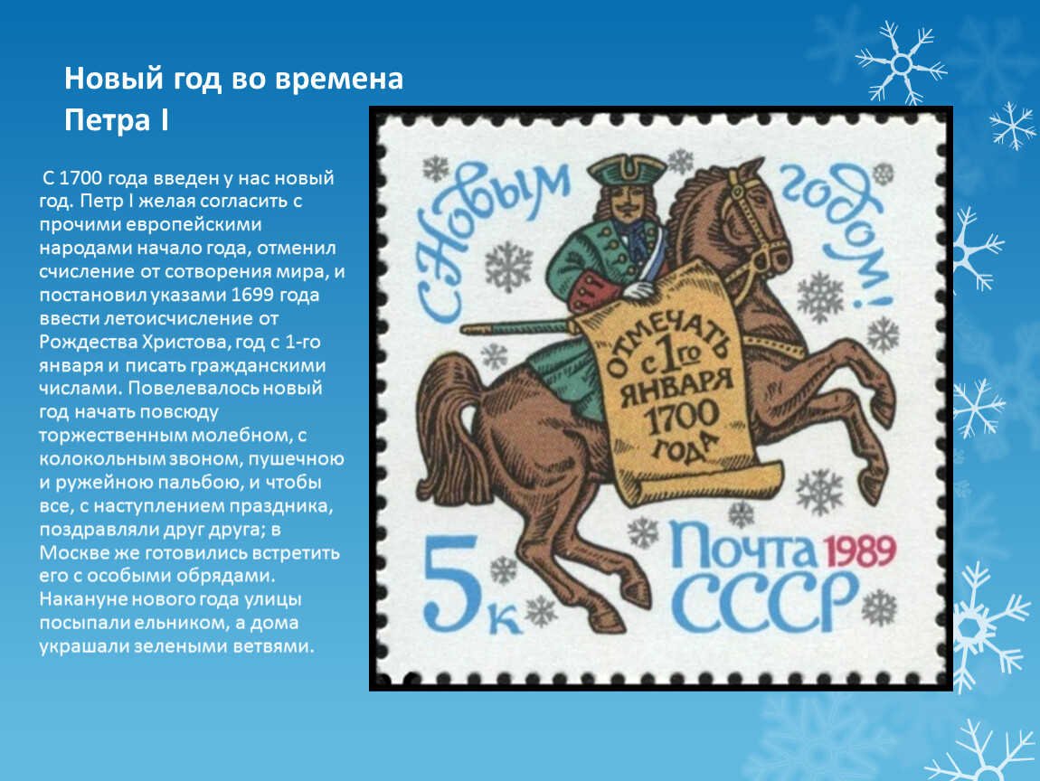 С 1700 года введен у нас новый год. Петр I желая согласить с прочими европейскими народами начало года, отменил счисление от сотворения мира, и постановил указами 1699 года ввести летоисчисление от Рождества Христова, год с 1-го января и писать гражданскими числами. Повелевалось новый год начать повсюду торжественным молебном, с колокольным звоном, пушечною и ружейною пальбою, и чтобы все, с наступлением праздника, поздравляли друг друга; в Москве же готовились встретить его с особыми обрядами. Накануне нового года улицы посыпали ельником, а дома украшали зелеными ветвями.