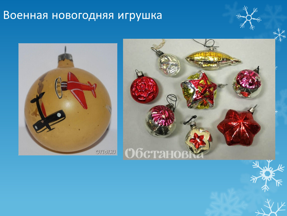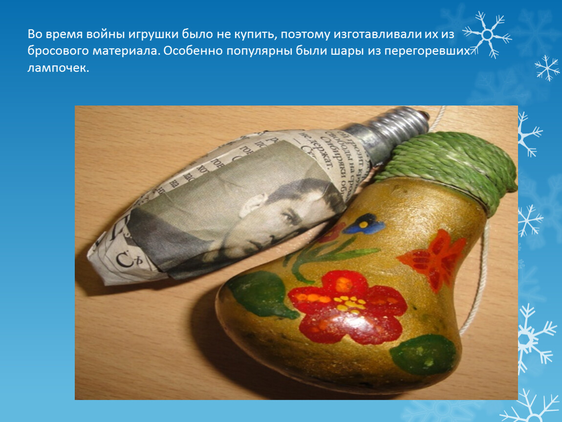 Во время войны игрушки было не купить, поэтому изготавливали их из бросового материала. Особенно популярны были шары из перегоревших лампочек.