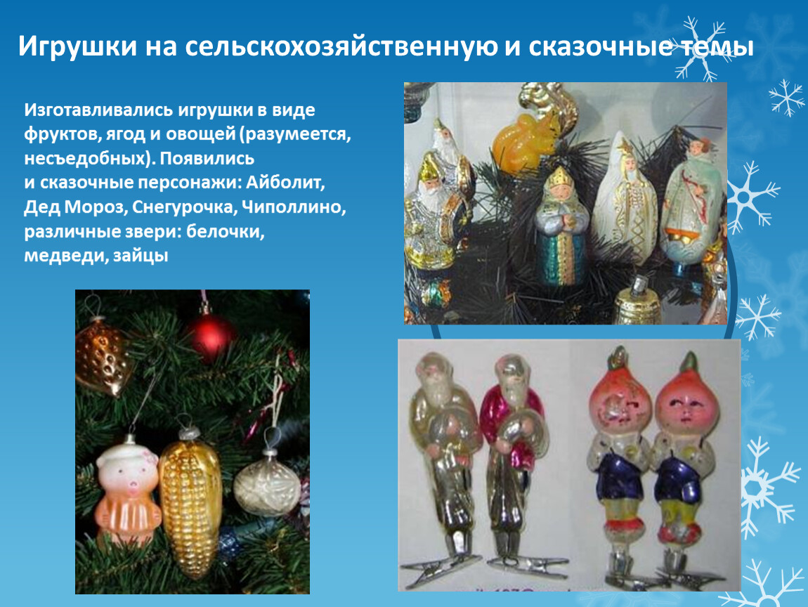 Изготавливались игрушки в виде фруктов, ягод и овощей (разумеется, несъедобных). Появились и сказочные персонажи: Айболит, Дед Мороз, Снегурочка, Чиполлино, различные звери: белочки, медведи, зайцы