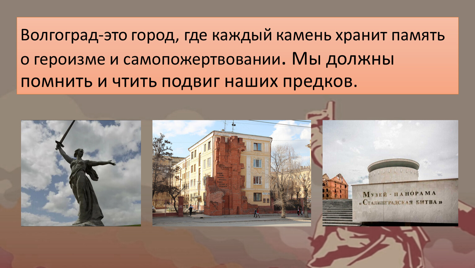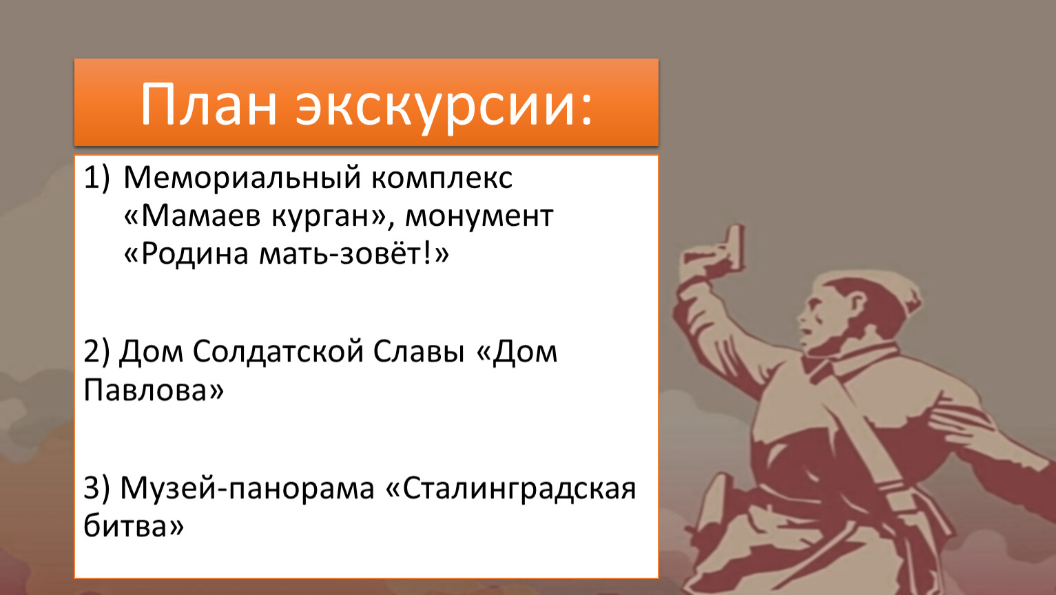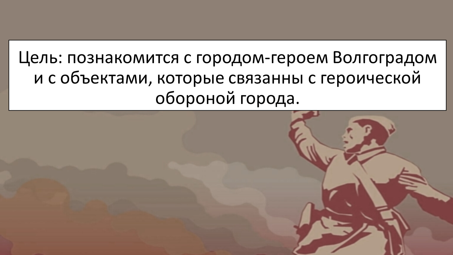 Цель: познакомится с городом-героем Волгоградом и с объектами, которые связанны с героической обороной города.