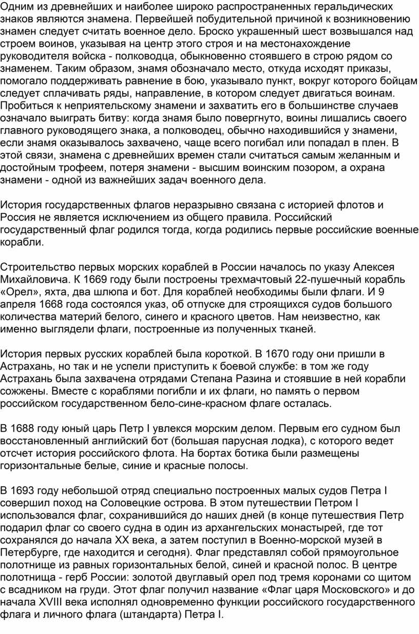 Исторический путь российского государственного флага долог - он насчитывает уже более трех веков. От первого появления на российских военных кораблях до наших дней флаг пережил немало перипетий, но он всегда служил России, являлся материальным выражением ее имени, и в этом качестве продолжает служить ныне.