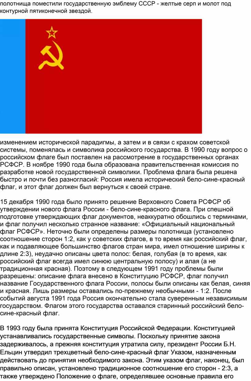 15 декабря 1990 года было принято решение Верховного Совета РСФСР об утверждении нового флага России - бело-сине-красного флага. При спешной подготовке утверждающих флаг документов, неаккуратно обошлись с терминами, и флаг получил несколько странное название: «Официальный национальный флаг РСФСР». Неточно были определены размеры полотнища (установлено соотношение сторон 1:2, как у советских флагов, в то время как российский флаг, как и подавляющее большинство флагов стран мира, имел отношение ширины к длине 2:3), неудачно описаны цвета полос: белая, голубая (в то время, как российский флаг всегда имел синюю центральную полосу) и алая (а не традиционная красная). Поэтому в следующем 1991 году проблемы были разрешены: описание флага внесено в Конституцию РСФСР, флаг получил название Государственного флага России, полосы были описаны как белая, синяя и красная. Лишь размеры оставались по-прежнему необычными - 1:2. После событий августа 1991 года Россия окончательно стала суверенным независимым государством. Флагом этого государства оставался старинный российский бело-сине-красный флаг.