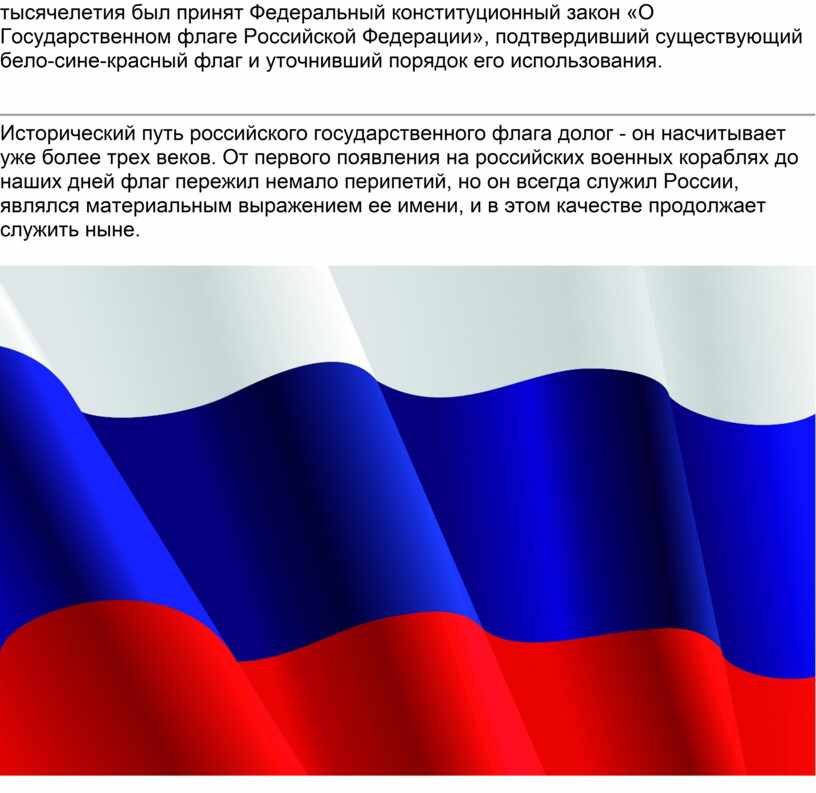 В 1993 году была принята Конституция Российской Федерации. Конституцией устанавливались государственные символы. Поскольку принятие закона задерживалось, а прежняя конституция утратила силу, президент России Б.Н. Ельцин утвердил трехцветный бело-сине-красный флаг Указом, назначенным действовать до принятия необходимого закона. Этим указом флаг, наконец, был правильно описан, установлено традиционное соотношение его сторон - 2:3, а также утверждено Положение о флаге, определявшее основные правила его использования. Процесс законодательного оформления Государственного флага был завершен 25 декабря 2000 года, когда накануне нового века и нового тысячелетия был принят Федеральный конституционный закон «О Государственном флаге Российской Федерации», подтвердивший существующий бело-сине-красный флаг и уточнивший порядок его использования.