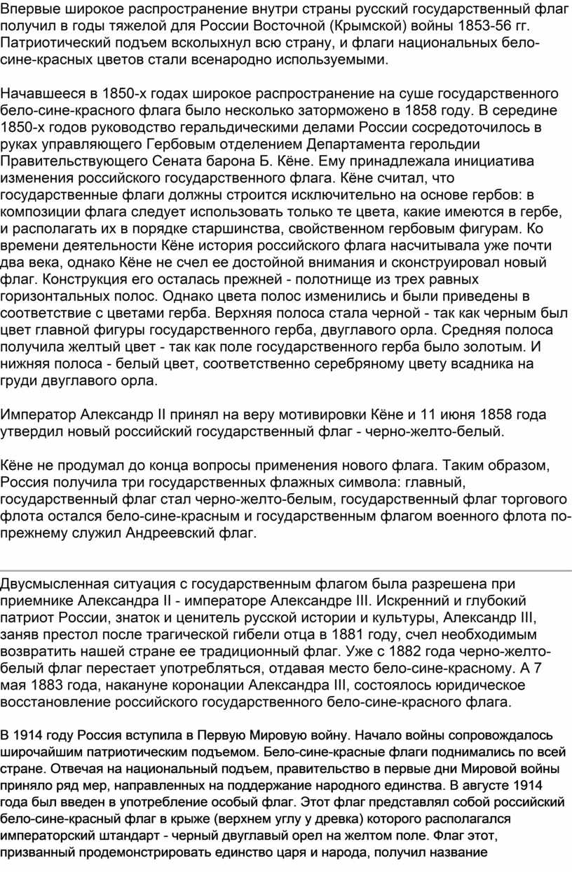 Впервые широкое распространение внутри страны русский государственный флаг получил в годы тяжелой для России Восточной (Крымской) войны 1853-56 гг. Патриотический подъем всколыхнул всю страну, и флаги национальных бело-сине-красных цветов стали всенародно используемыми.