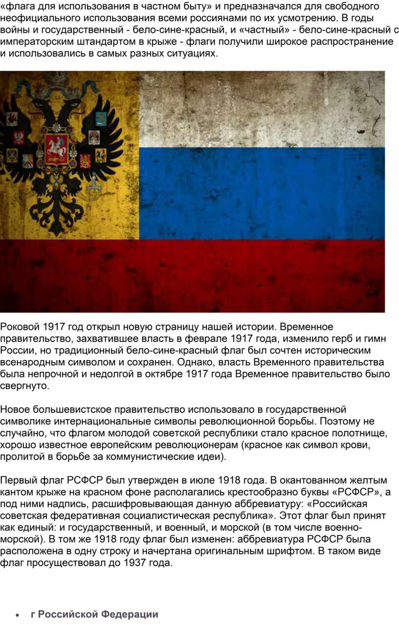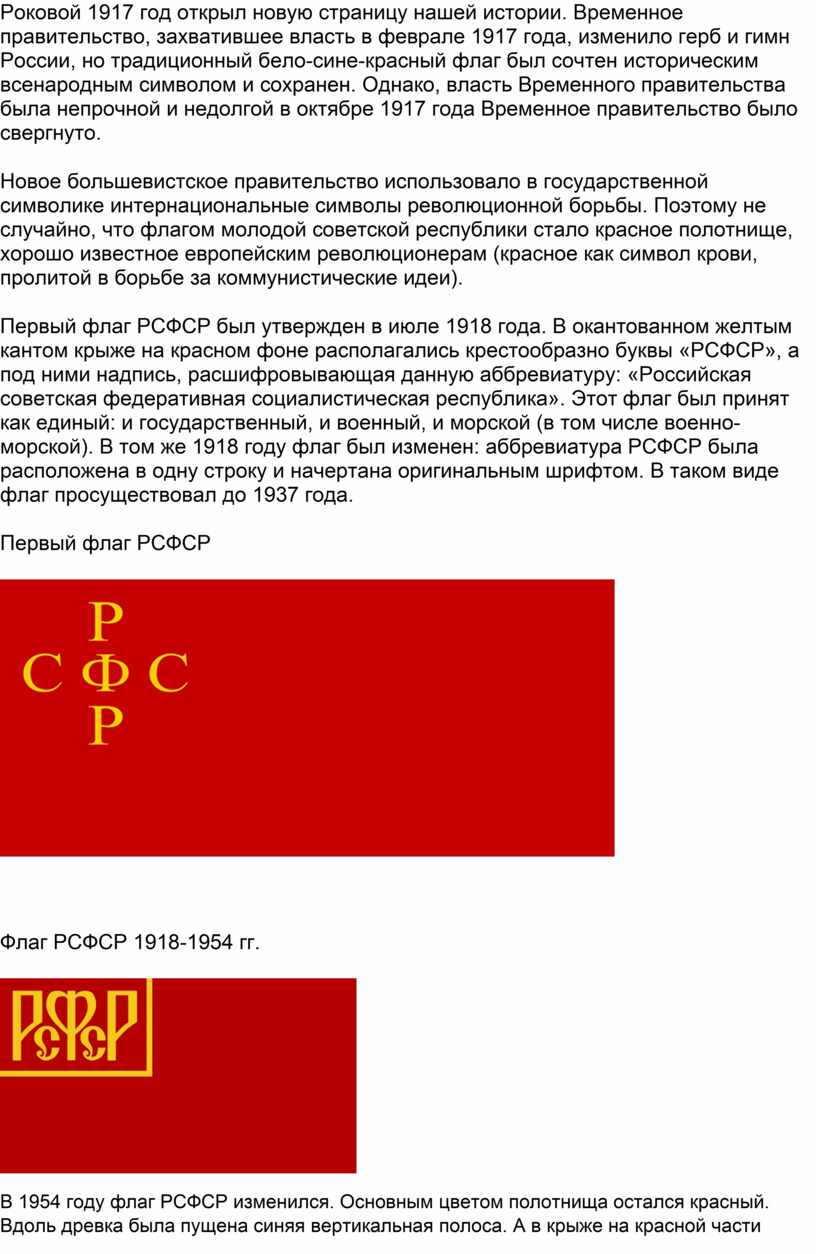 Роковой 1917 год открыл новую страницу нашей истории. Временное правительство, захватившее власть в феврале 1917 года, изменило герб и гимн России, но традиционный бело-сине-красный флаг был сочтен историческим всенародным символом и сохранен. Однако, власть Временного правительства была непрочной и недолгой в октябре 1917 года Временное правительство было свергнуто.