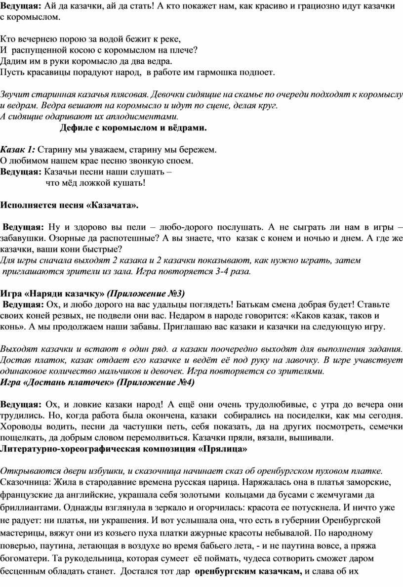 В зале стоят скамейки, на них сидят «мальчики-казаки» и девочки-«казачки» . Выходит ведущая.