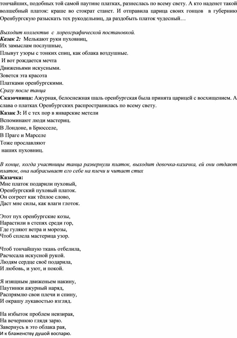 Сказочница: Жила в стародавние времена русская царица. Наряжалась она в платья заморские, французские да английские, украшала себя золотыми кольцами да бусами с жемчугами да бриллиантами. Однажды взглянула в зеркало и огорчилась: красота ее потускнела. И ничто уже не радует: ни платья, ни украшения. И вот услышала она, что есть в губернии Оренбургской мастерицы, вяжут они из козьего пуха платки ажурные красоты небывалой. По народному поверью, паутина, летающая в воздухе во время бабьего лета, - и не паутина вовсе, а пряжа богоматери. Та рукодельница, которая сумеет её поймать, чудеса сотворить сможет даром бесценным обладать станет. Достался тот дар оренбургским казачкам, и слава об их тончайших, подобных той самой паутине платках, разнеслась по всему свету. А кто наденет такой волшебный платок: краше во стократ станет. И отправила царица своих гонцов в губернию Оренбургскую разыскать тех рукодельниц, да раздобыть платок чудесный…