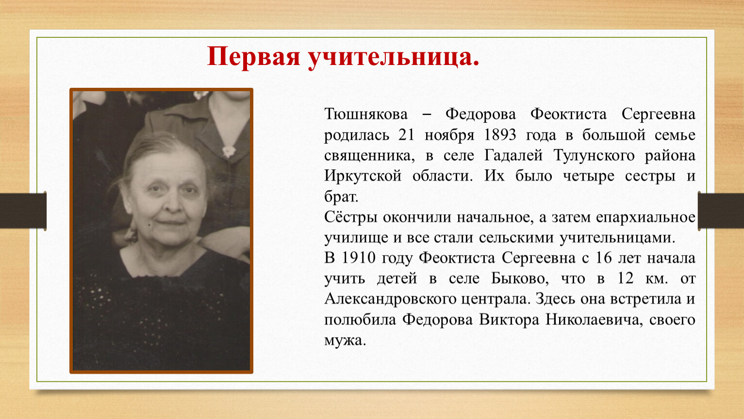 В 1910 году Феоктиста Сергеевна с 16 лет начала учить детей в селе Быково, что в 12 км. от Александровского централа. Здесь она встретила и полюбила Федорова Виктора Николаевича, своего мужа.