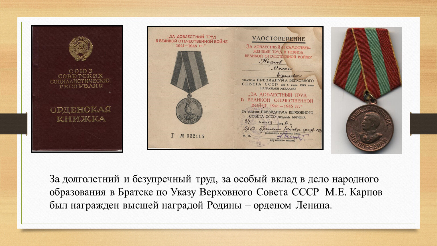 За долголетний и безупречный труд, за особый вклад в дело народного образования в Братске по Указу Верховного Совета СССР М.Е. Карпов был награжден высшей наградой Родины – орденом Ленина.