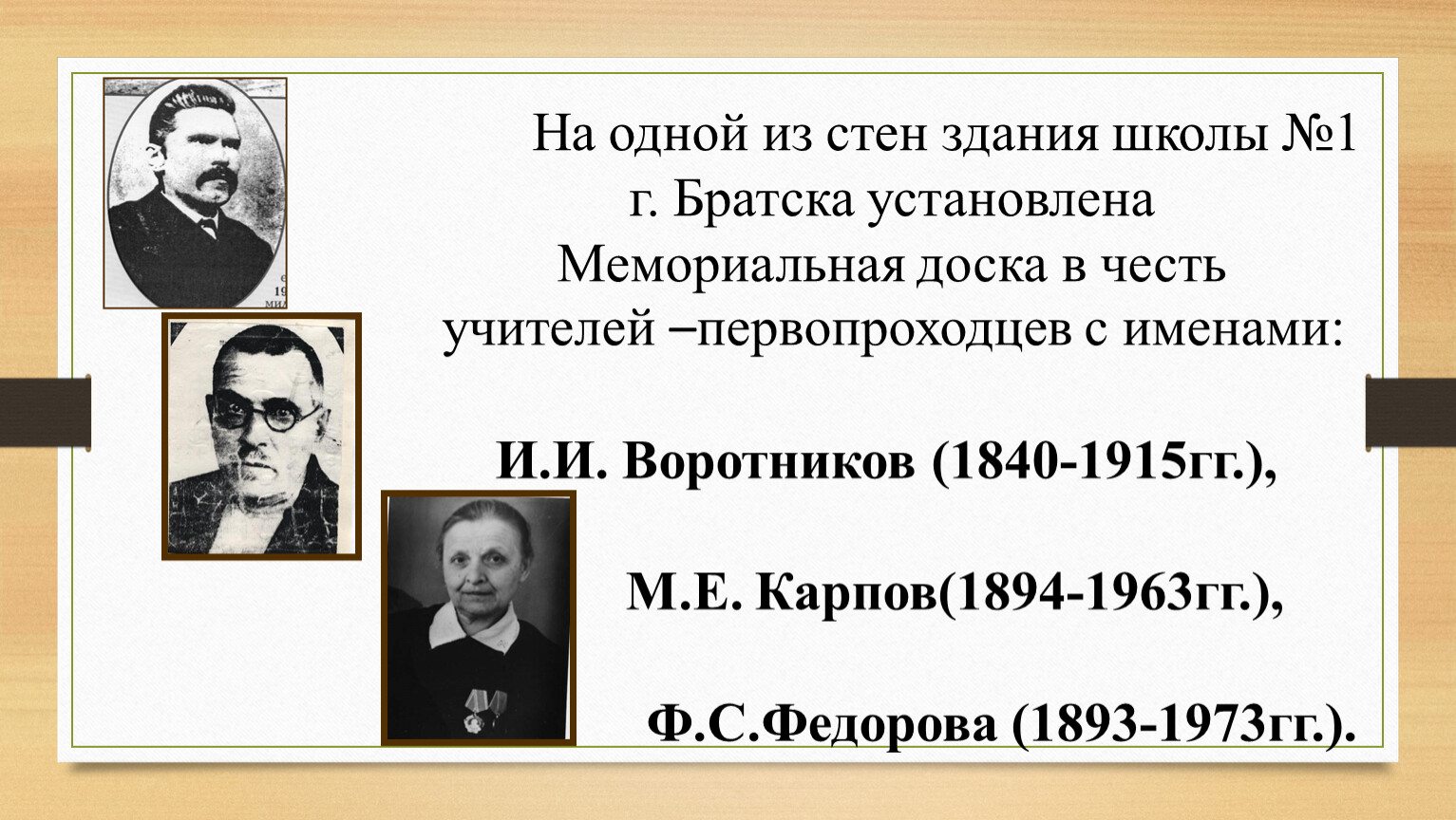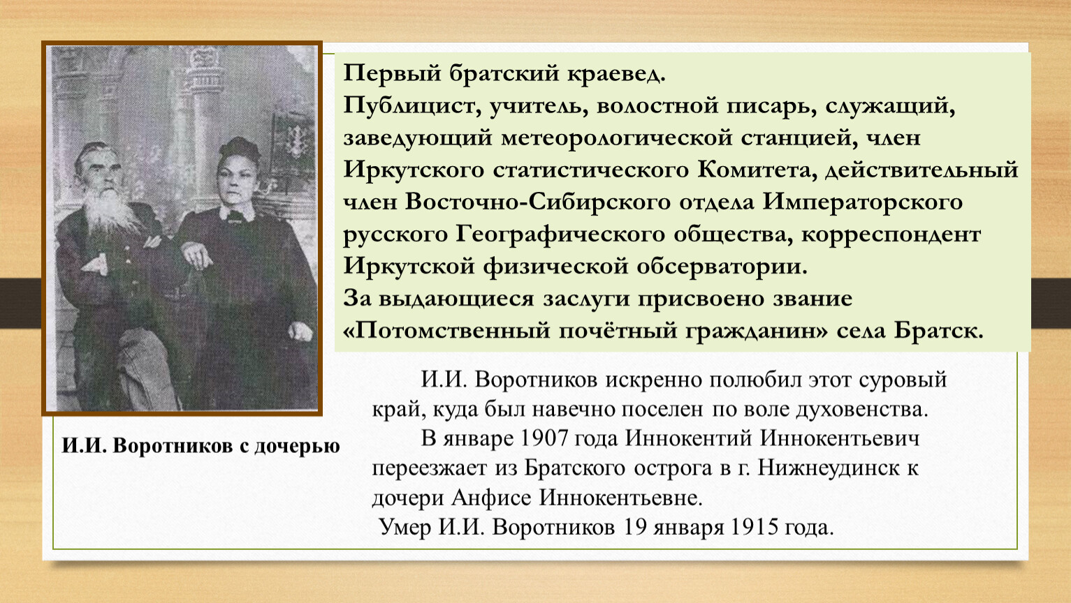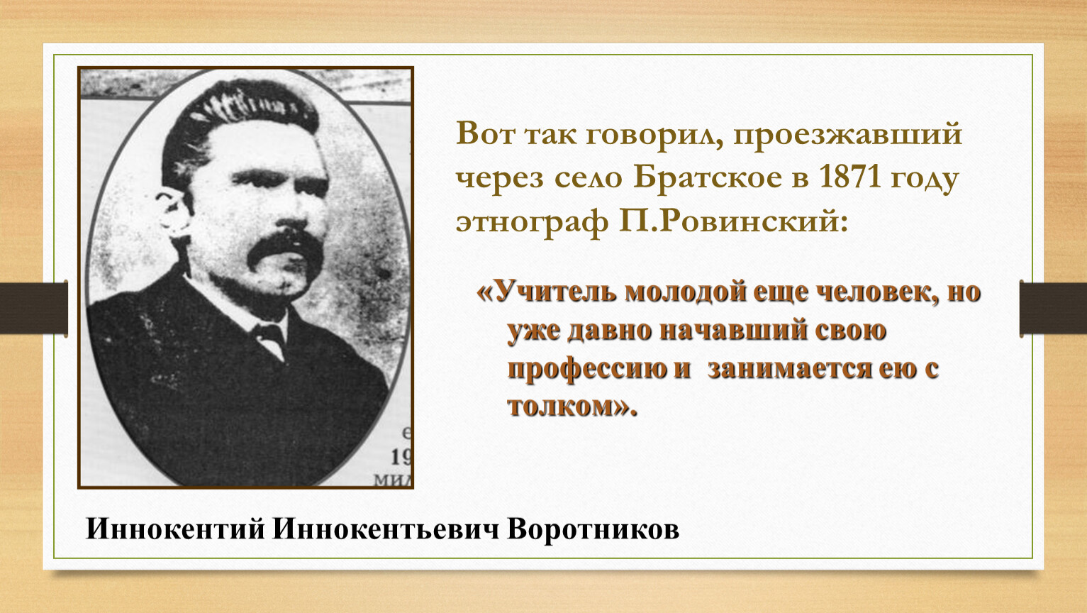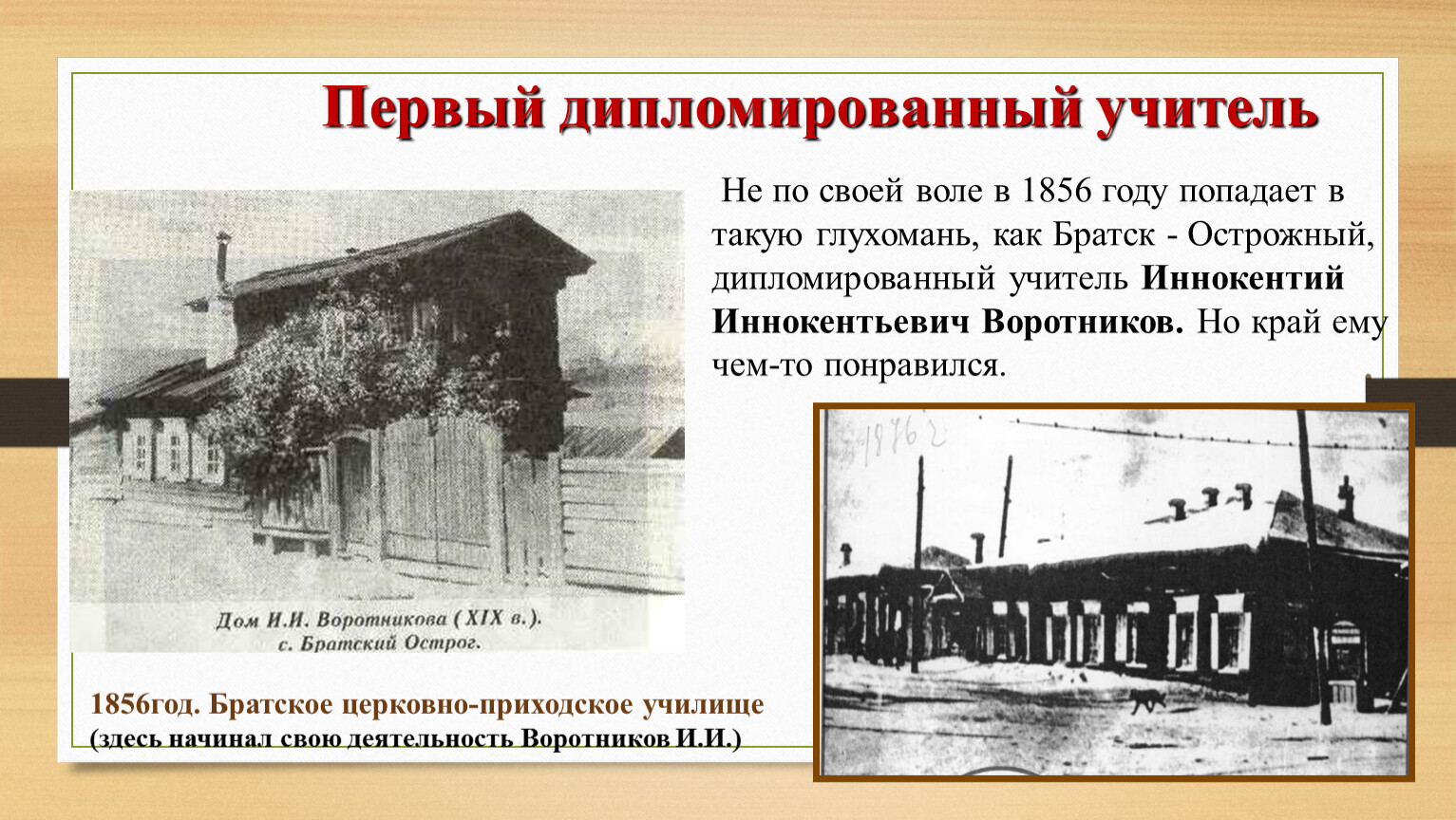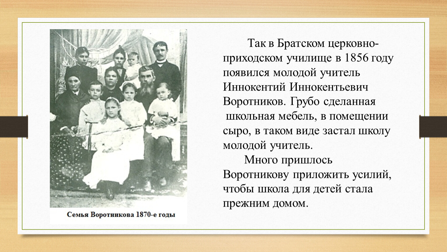 Так в Братском церковно-приходском училище в 1856 году появился молодой учитель Иннокентий Иннокентьевич Воротников. Грубо сделанная
