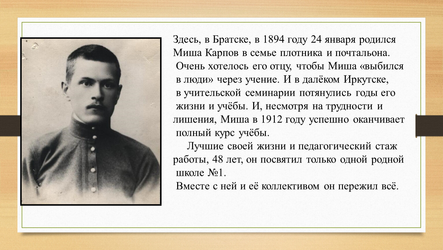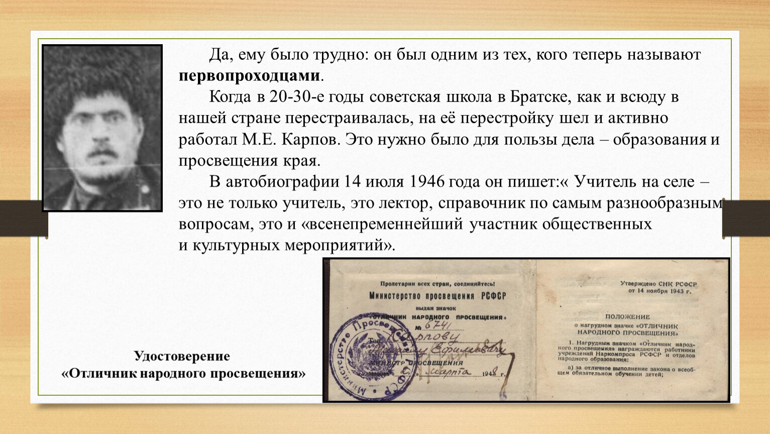 Когда в 20-30-е годы советская школа в Братске, как и всюду в нашей стране перестраивалась, на её перестройку шел и активно работал М.Е. Карпов. Это нужно было для пользы дела – образования и просвещения края.