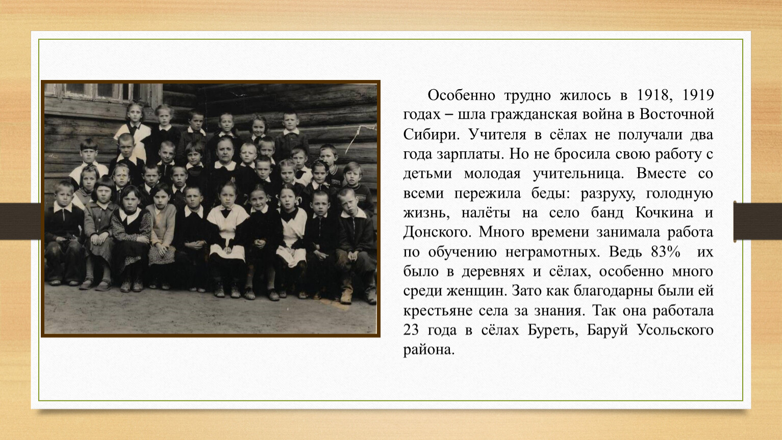 Особенно трудно жилось в 1918, 1919 годах – шла гражданская война в Восточной Сибири. Учителя в сёлах не получали два года зарплаты. Но не бросила свою работу с детьми молодая учительница. Вместе со всеми пережила беды: разруху, голодную жизнь, налёты на село банд Кочкина и Донского. Много времени занимала работа по обучению неграмотных. Ведь 83% их было в деревнях и сёлах, особенно много среди женщин. Зато как благодарны были ей крестьяне села за знания. Так она работала 23 года в сёлах Буреть, Баруй Усольского района.