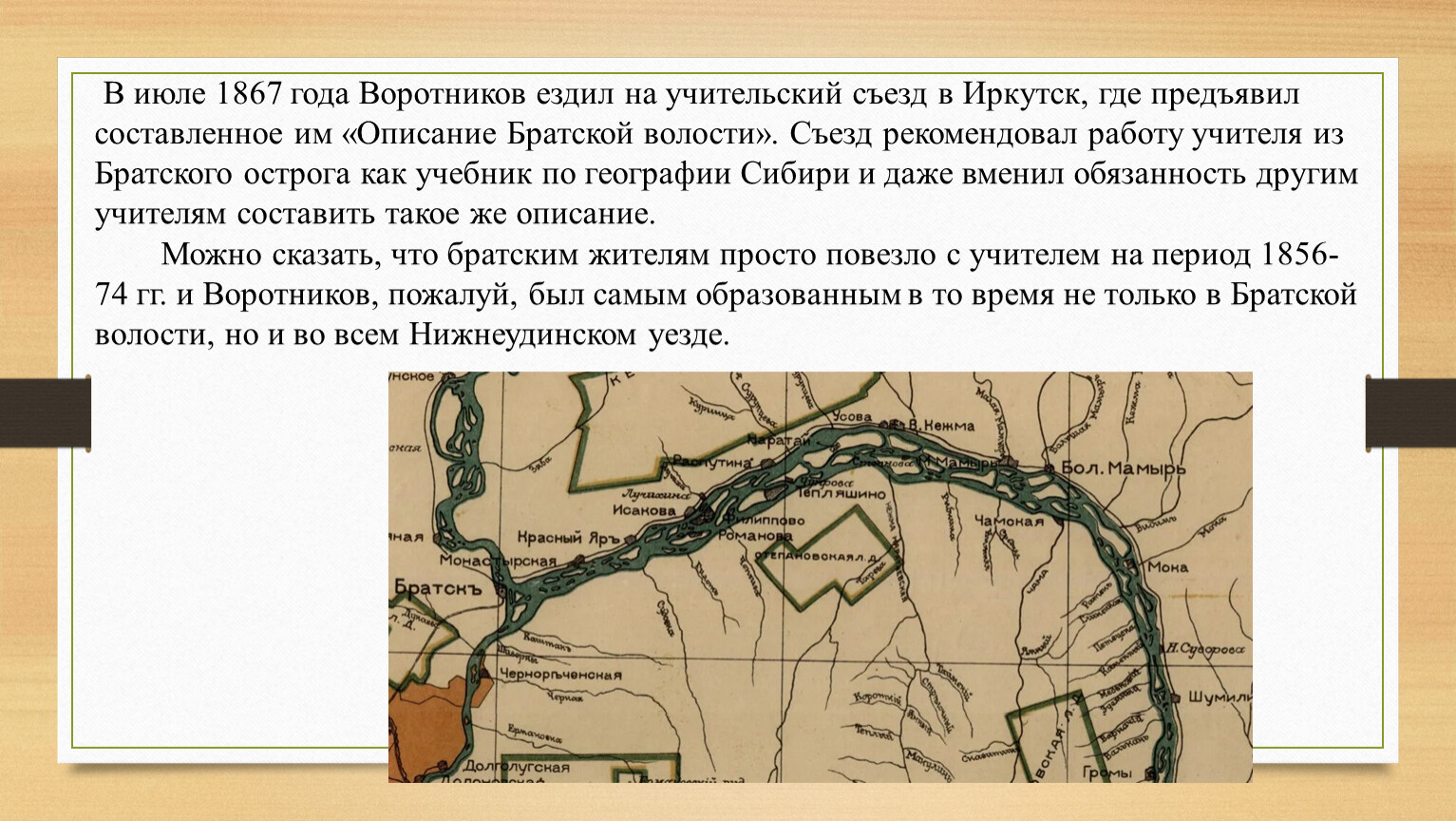 В июле 1867 года Воротников ездил на учительский съезд в Иркутск, где предъявил составленное им «Описание Братской волости». Съезд рекомендовал работу учителя из Братского острога как учебник по географии Сибири и даже вменил обязанность другим учителям составить такое же описание. Можно сказать, что братским жителям просто повезло с учителем на период 1856-74 гг. и Воротников, пожалуй, был самым образованным в то время не только в Братской волости, но и во всем Нижнеудинском уезде.