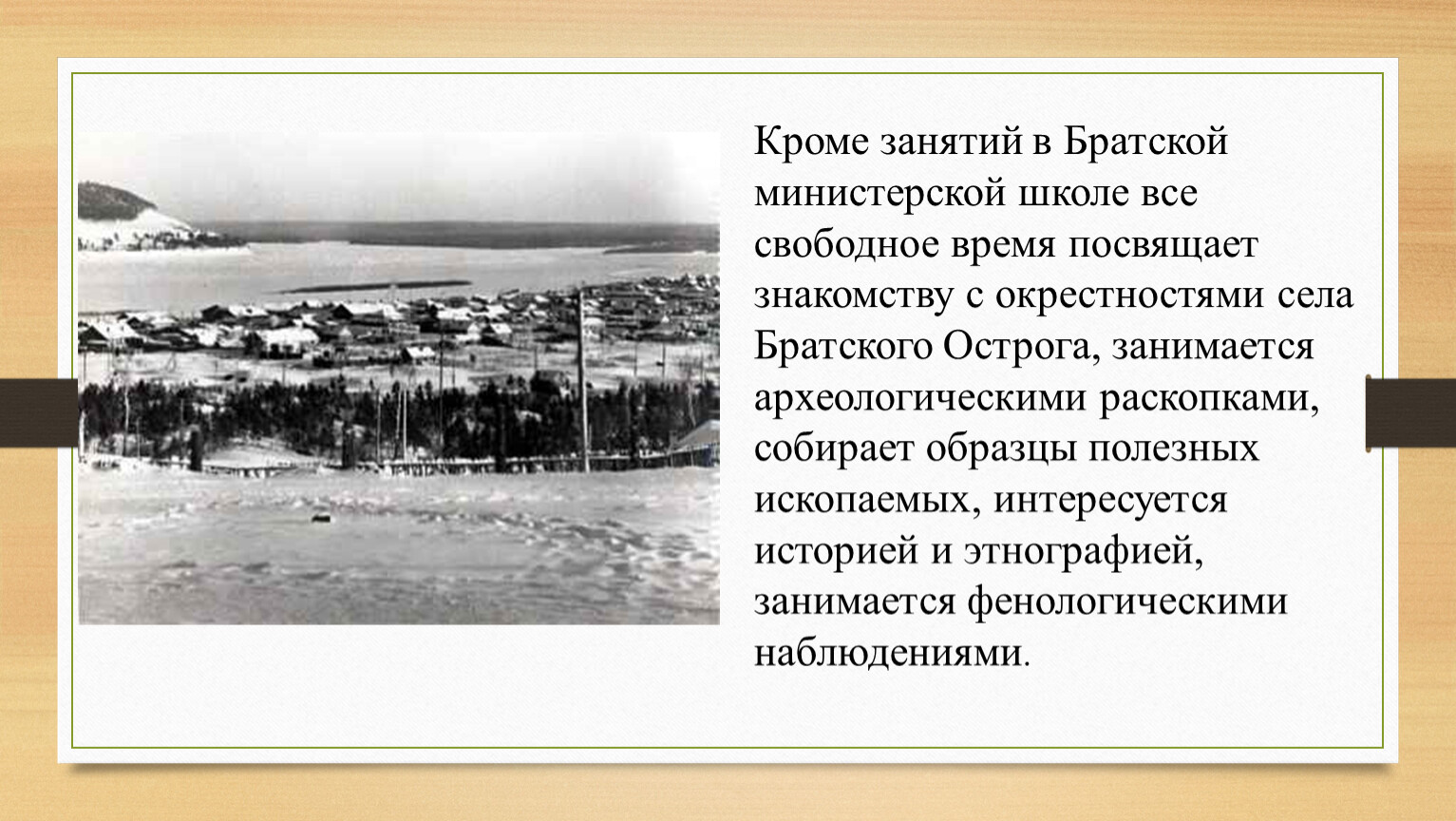 Кроме занятий в Братской министерской школе все свободное время посвящает знакомству с окрестностями села Братского Острога, занимается археологическими раскопками, собирает образцы полезных ископаемых, интересуется историей и этнографией, занимается фенологическими наблюдениями.