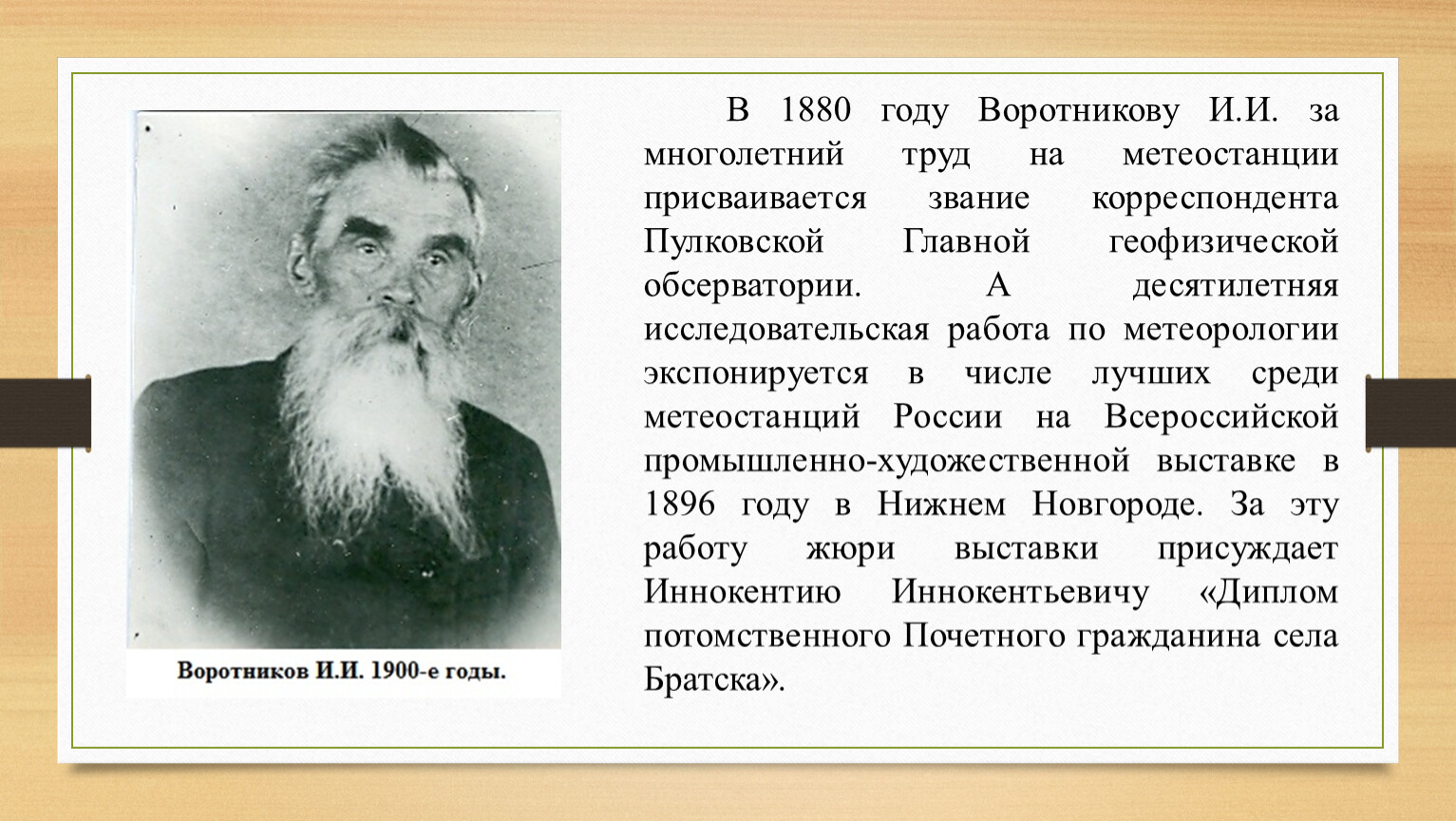 В 1880 году Воротникову И.И. за многолетний труд на метеостанции присваивается звание корреспондента Пулковской Главной геофизической обсерватории. А десятилетняя исследовательская работа по метеорологии экспонируется в числе лучших среди метеостанций России на Всероссийской промышленно-художественной выставке в 1896 году в Нижнем Новгороде. За эту работу жюри выставки присуждает Иннокентию Иннокентьевичу «Диплом потомственного Почетного гражданина села Братска».