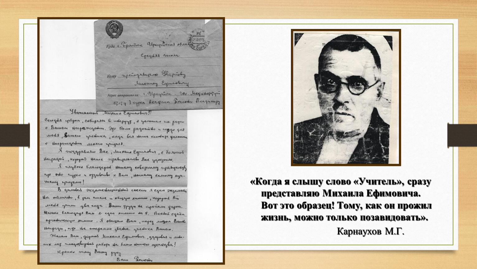 «Когда я слышу слово «Учитель», сразу представляю Михаила Ефимовича. Вот это образец! Тому, как он прожил жизнь, можно только позавидовать».