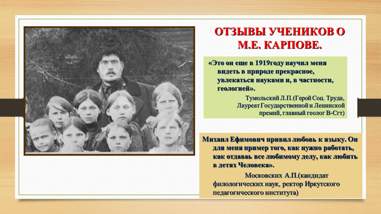 ОТЗЫВЫ УЧЕНИКОВ О М.Е. КАРПОВЕ.