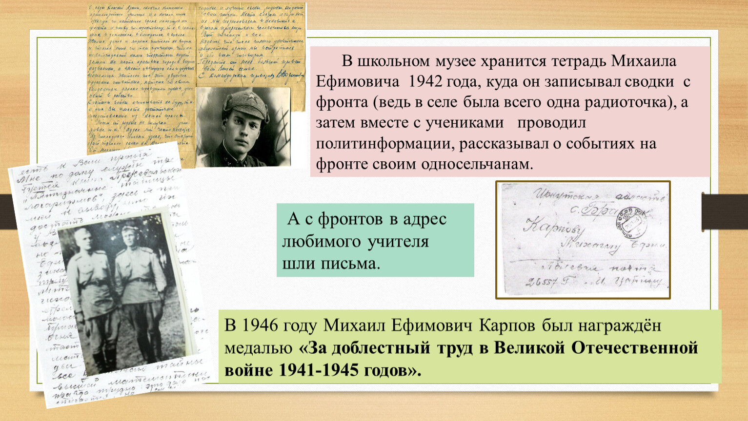 В школьном музее хранится тетрадь Михаила Ефимовича 1942 года, куда он записывал сводки с фронта (ведь в селе была всего одна радиоточка), а затем вместе с учениками проводил политинформации, рассказывал о событиях на фронте своим односельчанам.