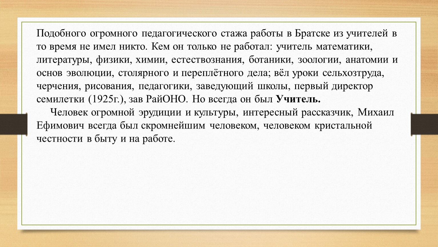 Подобного огромного педагогического стажа работы в Братске из учителей в то время не имел никто. Кем он только не работал: учитель математики, литературы, физики, химии, естествознания, ботаники, зоологии, анатомии и основ эволюции, столярного и переплётного дела; вёл уроки сельхозтруда, черчения, рисования, педагогики, заведующий школы, первый директор семилетки (1925г.), зав РайОНО. Но всегда он был Учитель.