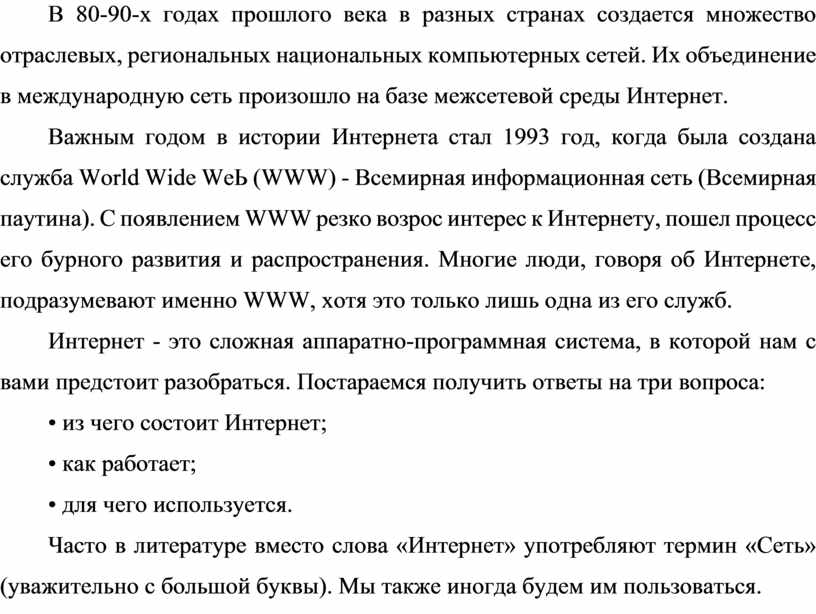 В 80-90-х годах прошлого века в разных странах создается множество отраслевых, региональных национальных компьютерных сетей. Их объединение в международную сеть произошло на базе межсетевой среды Интернет.