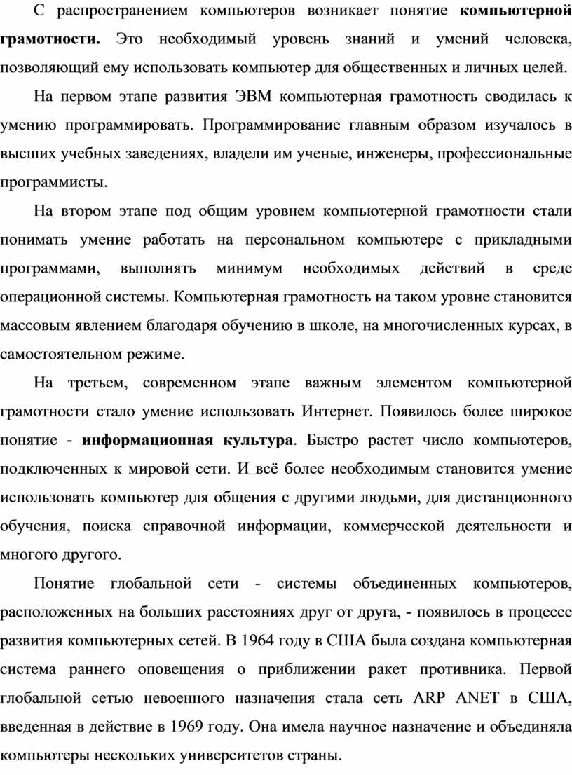 С распространением компьютеров возникает понятие компьютерной грамотности. Это необходимый уровень знаний и умений человека, позволяющий ему использовать компьютер для общественных и личных целей.