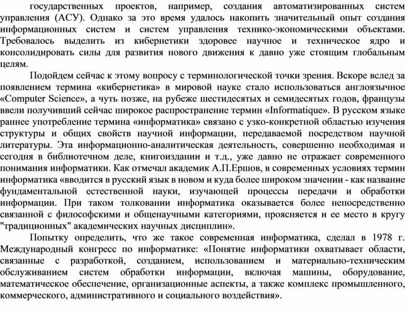 Подойдем сейчас к этому вопросу с терминологической точки зрения. Вскоре вслед за появлением термина «кибернетика» в мировой науке стало использоваться англоязычное «Computer Science», а чуть позже, на рубеже шестидесятых и семидесятых годов, французы ввели получивший сейчас широкое распространение термин «Informatique». В русском языке раннее употребление термина «информатика» связано с узко-конкретной областью изучения структуры и общих свойств научной информации, передаваемой посредством научной литературы. Эта информационно-аналитическая деятельность, совершенно необходимая и сегодня в библиотечном деле, книгоиздании и т.д., уже давно не отражает современного понимания информатики. Как отмечал академик А.П.Ершов, в современных условиях термин информатика «вводится в русский язык в новом и куда более широком значении - как название фундаментальной естественной науки, изучающей процессы передачи и обработки информации. При таком толковании информатика оказывается более непосредственно связанной с философскими и общенаучными категориями, проясняется и ее место в кругу "традиционных" академических научных дисциплин».